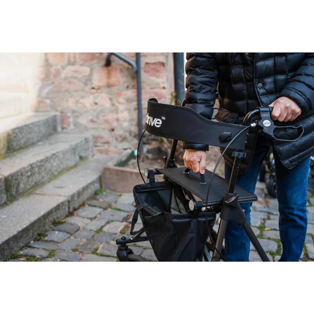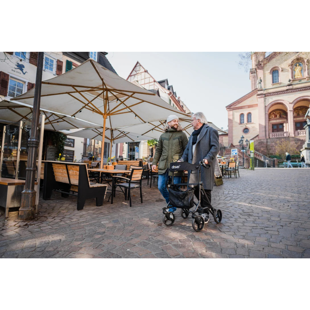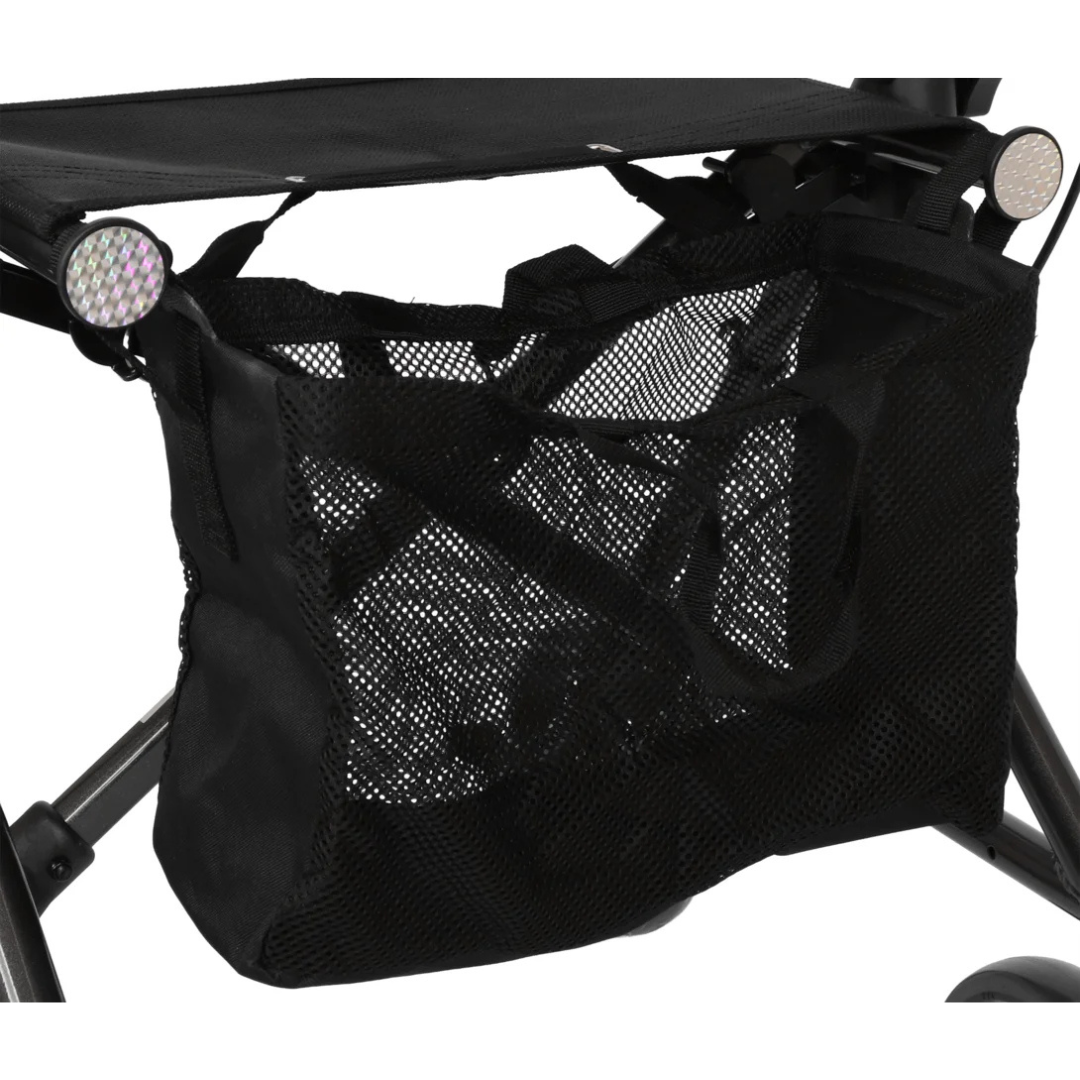 Dankzij zijn compacte ontwerp en doordachte details is deze rollator zowel binnen als buiten comfortabel in gebruik. De ergonomisch gevormde handvatten zijn eenvoudig in hoogte te verstellen, zodat u altijd de juiste loophouding vindt. De gepolsterde rugsteun, het handige netje, de stokhouder en de opstaphulp worden standaard meegeleverd – zo bent u meteen klaar om op pad te gaan.