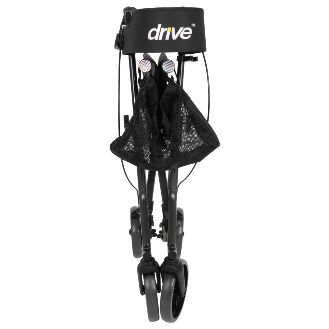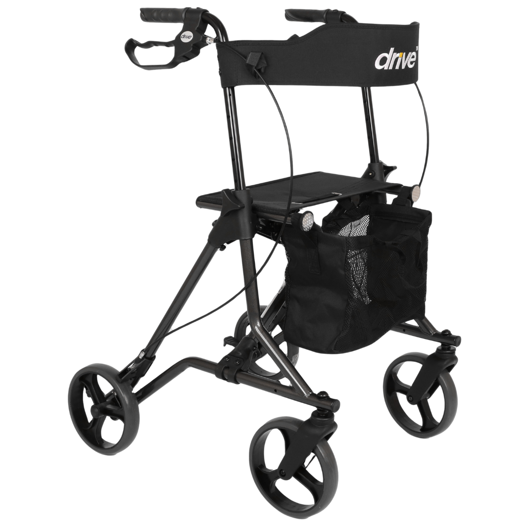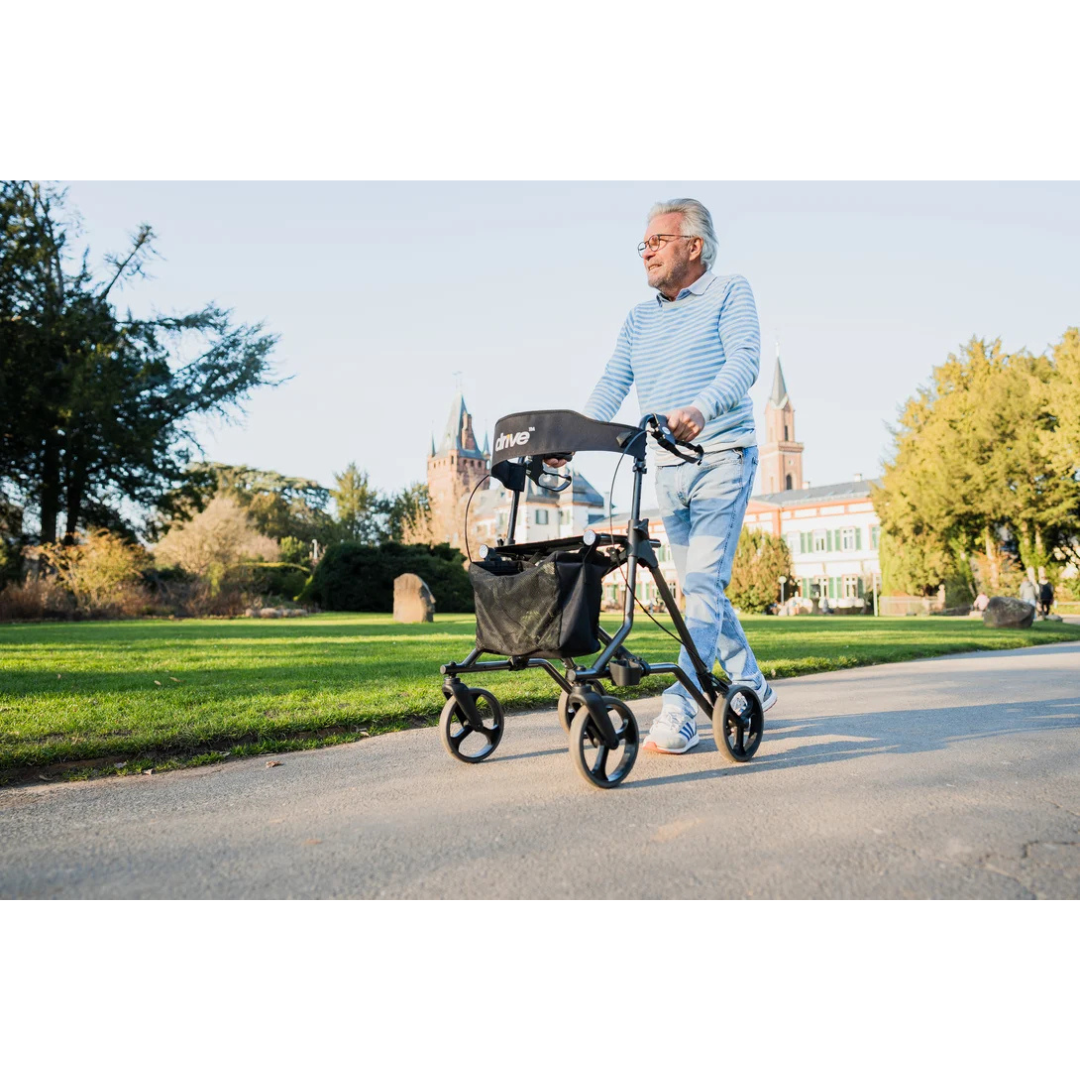 Dankzij zijn compacte ontwerp en doordachte details is deze rollator zowel binnen als buiten comfortabel in gebruik. De ergonomisch gevormde handvatten zijn eenvoudig in hoogte te verstellen, zodat u altijd de juiste loophouding vindt. De gepolsterde rugsteun, het handige netje, de stokhouder en de opstaphulp worden standaard meegeleverd – zo bent u meteen klaar om op pad te gaan.