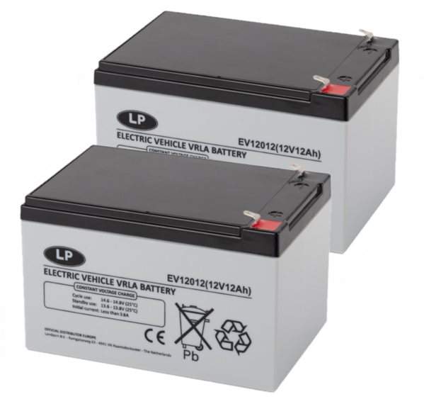 Betrouwbare Landport EV12012 AGM-accu’s voor scootmobielen. Deze onderhoudsvrije accu’s worden geleverd als set van 2 stuks, omdat scootmobielen altijd twee identieke accu’s vereisen voor een correcte werking en optimale prestaties.