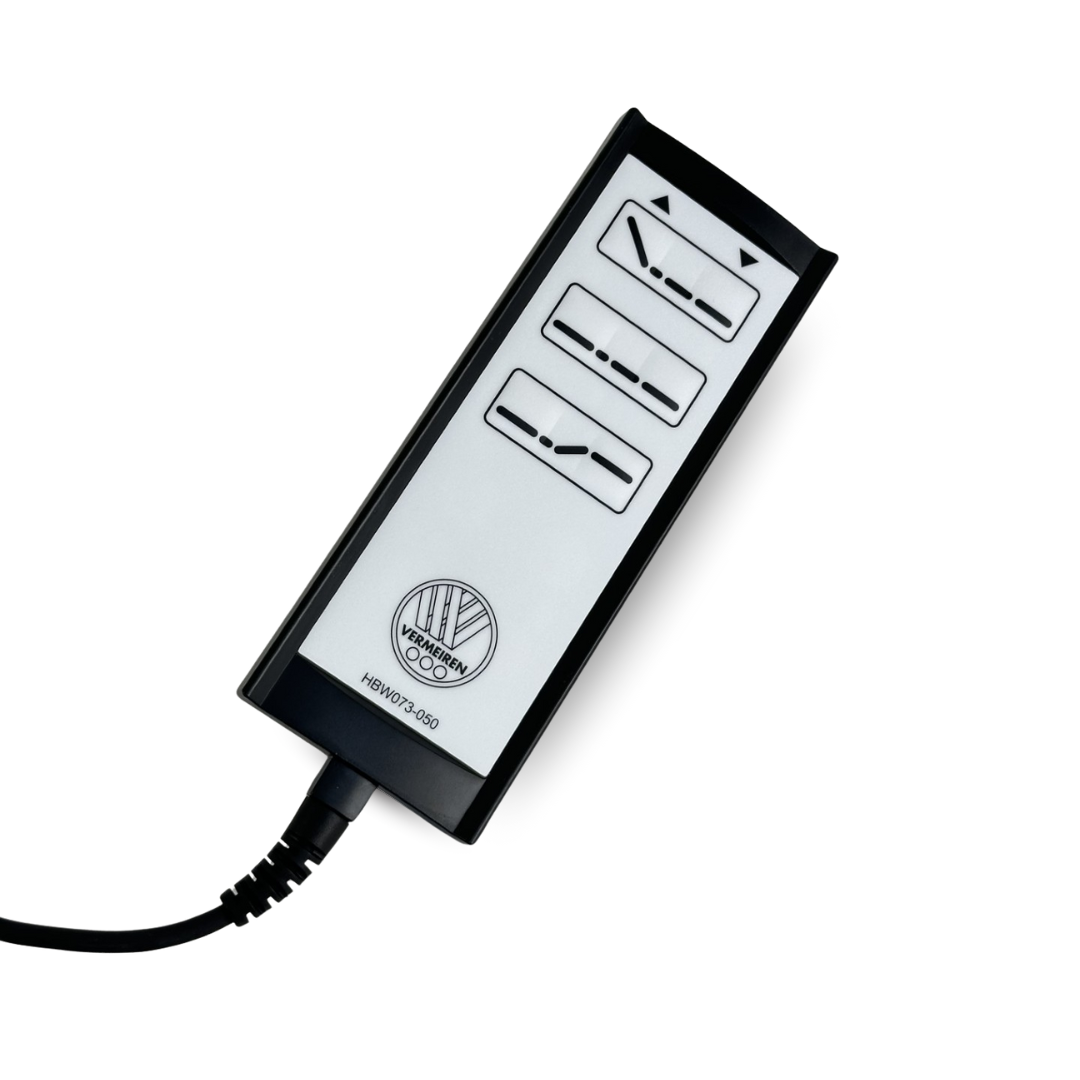 De afstandsbediening is voorzien van duidelijk gemarkeerde knoppen met symbolen, zodat de bediening eenvoudig is voor iedere gebruiker. De stekker (aansluitplug) past rechtstreeks op de bestaande Vermeiren-bedmotor, waardoor montage geen technische kennis vereist.