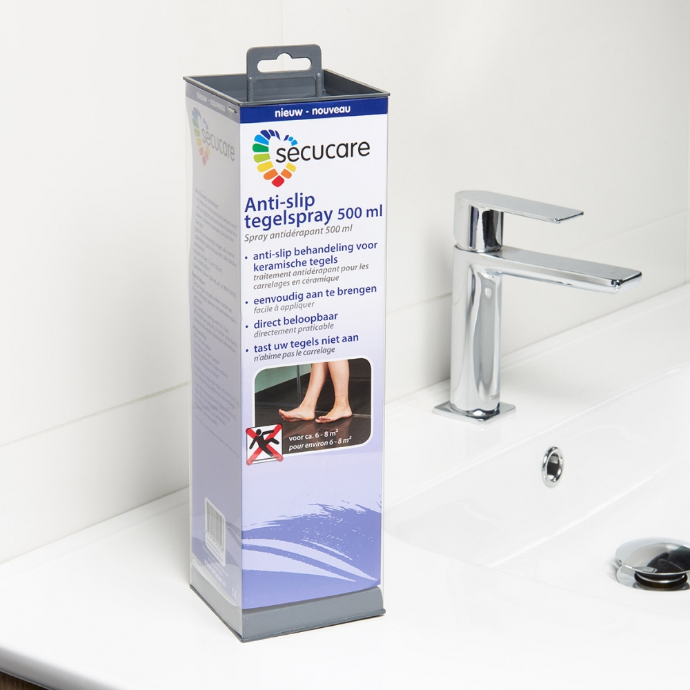 Deze anti-slip tegelspray van het merk SecuCare vermindert de kans op uitglijden in een vochtige omgeving, zoals bijvoorbeeld in een douche of badkamer. De spray is gemakkelijk aan te brengen en is na de behandeling direct beloopbaar. De tegelspray bevat geen gevaarlijke oplosmiddelen of giftige chemicaliën en is volledig biologisch afbreekbaar.