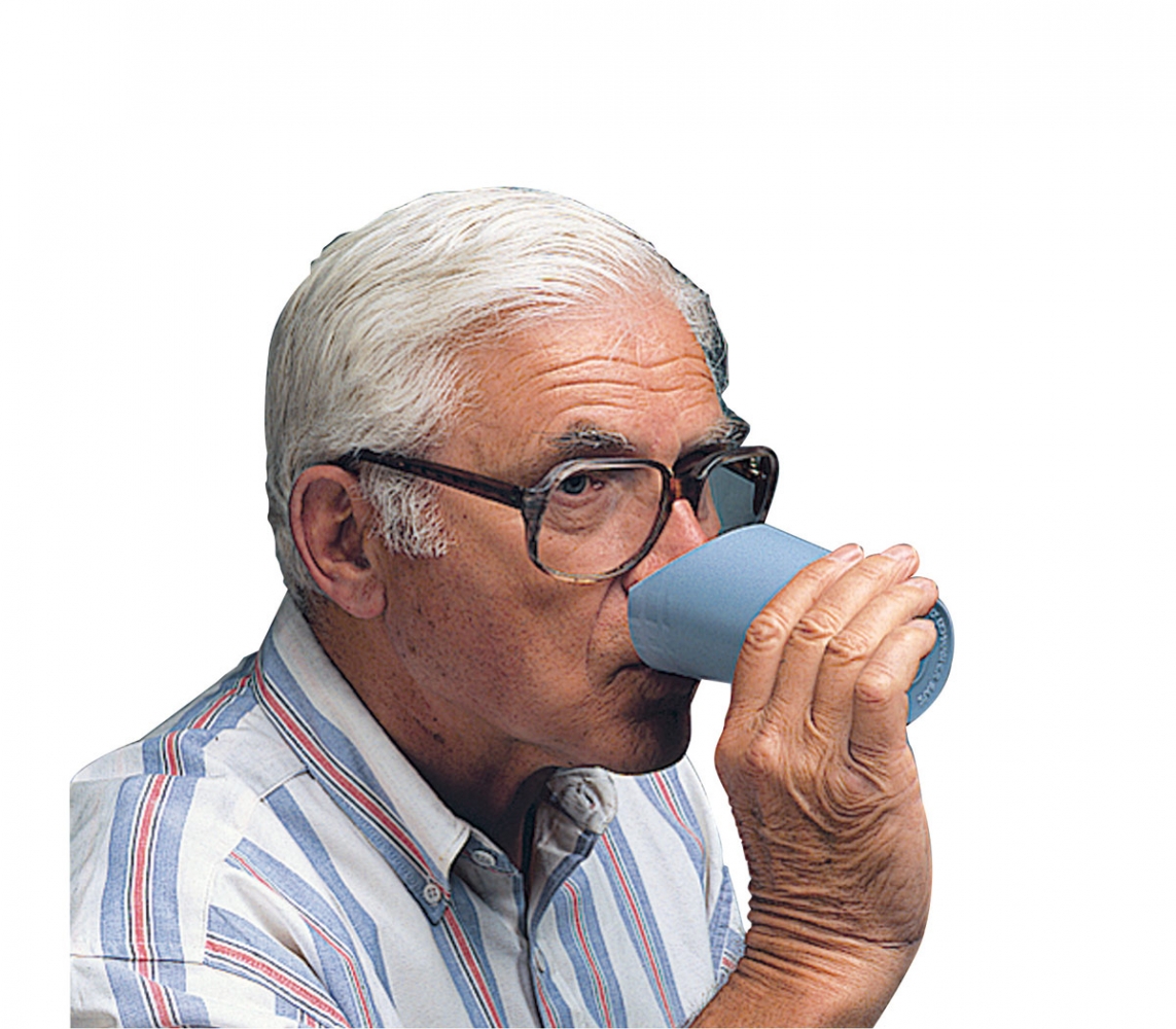 Een uitkomst voor mensen die het hoofd niet naar achteren kunnen buigen. De neus past in de opening tijdens het drinken. Gemaakt van onbreekbaar plastic. Geschikt voor de magnetron en vaatwasser. Ook verkrijgbaar in de kleur transparant groen.