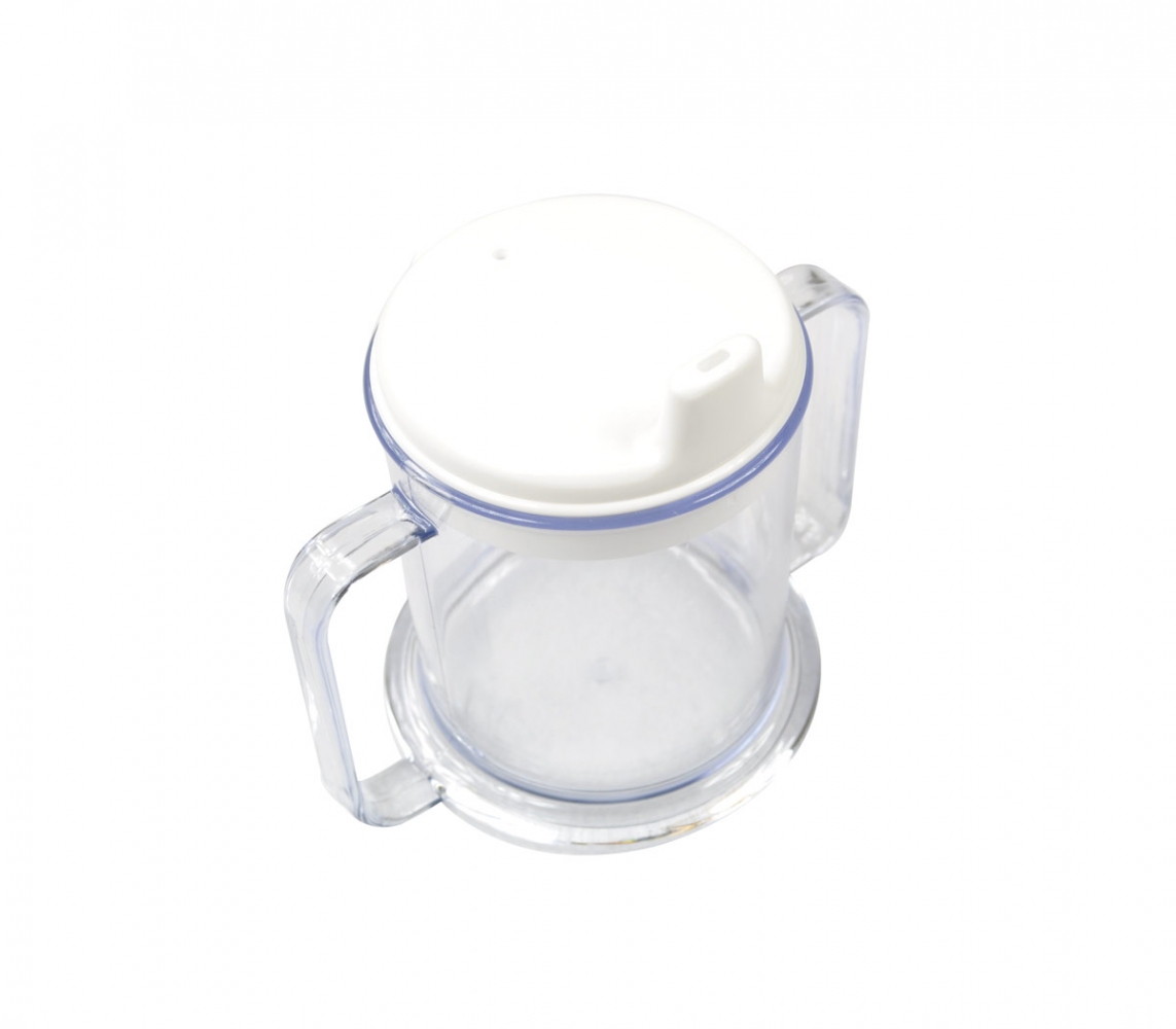 Deze transparante plastic beker heeft twee handgrepen en is bedoeld voor mensen met een tremor of een geringe grijpkracht. Inclusief tuitdeksel (opening 4 mm) om morsen te voorkomen.