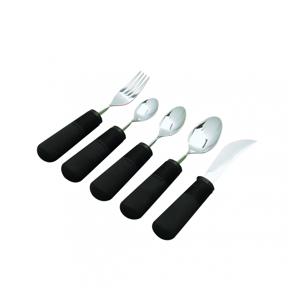 Dit bestek heeft zachte en schokabsorberende handvaten die ook bij vochtigheid een goede houvast hebben. De comfortabele grepen zijn tot 3,5 cm verdikt en gemaakt van zacht rubberachtig materiaal met flexibele ribbels die zich aan iedere hand aanpassen.