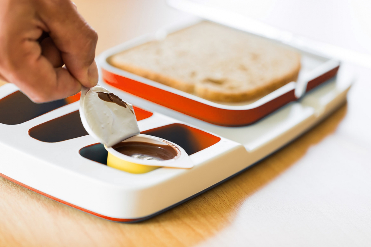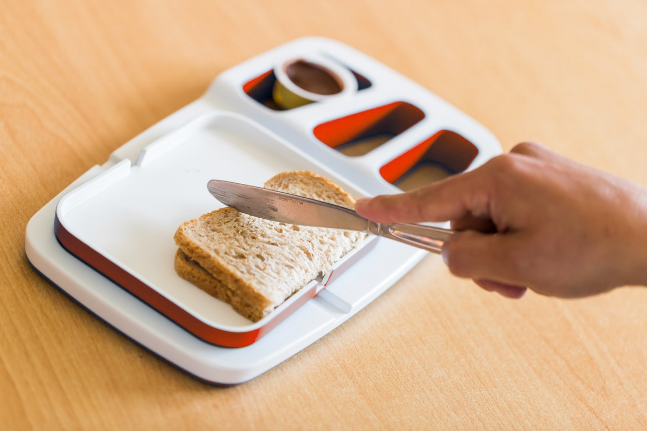 Het multifunctionele bord heeft spievormige anti-slip vakjes waarin allerlei producten passen en vastgeklemd blijven. Hierdoor kunnen de producten éénhandig geopend worden.