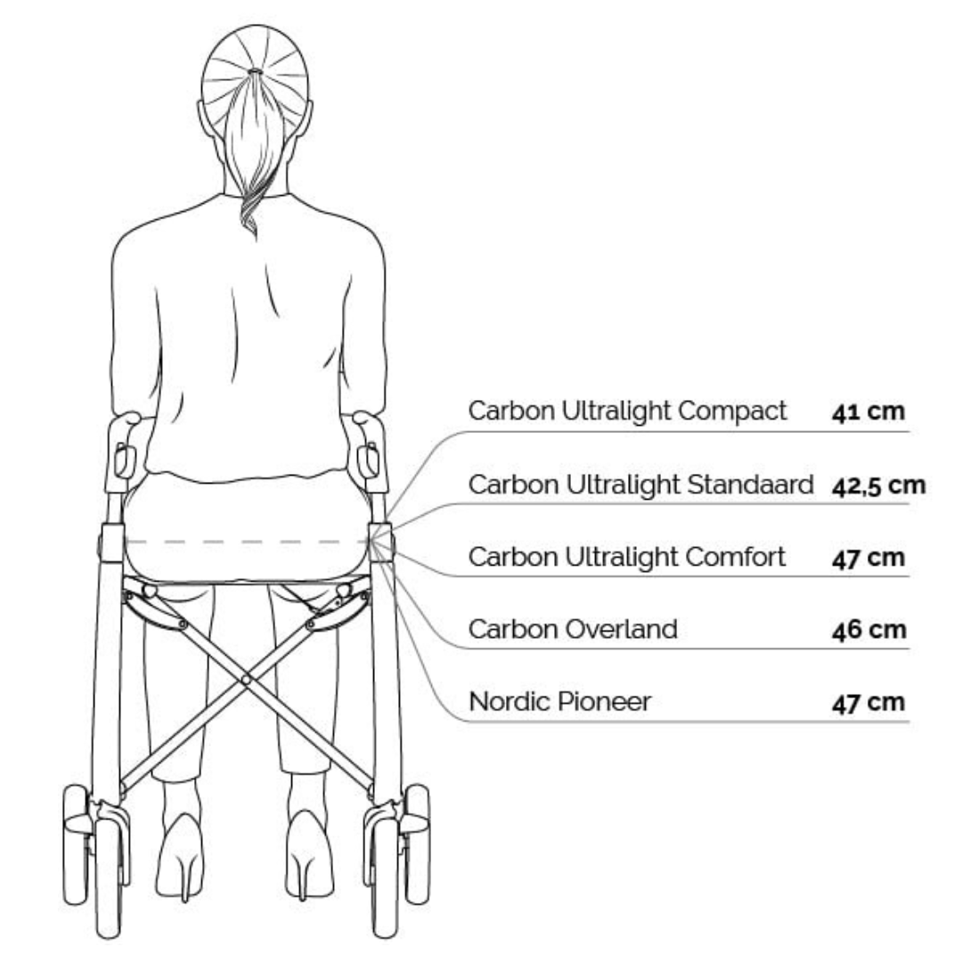 De meeste mensen kiezen voor het Comfort-model (L), omdat dit de ruimste uitvoering is. De Compact (S) en Standaard (M) zijn smaller dan de meeste standaardrollators, waarbij de Compact bovendien een aanzienlijk lagere zitting heeft.