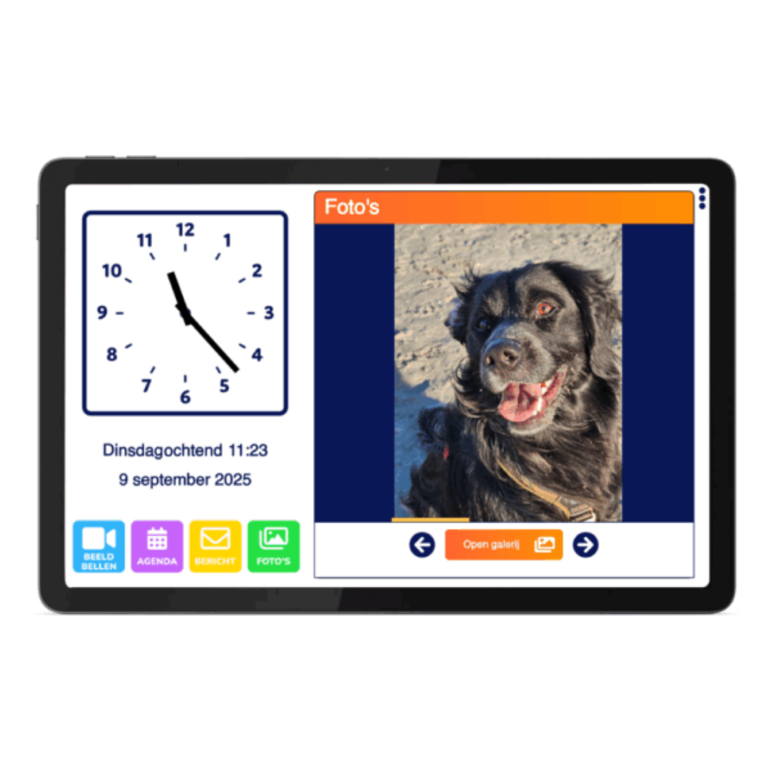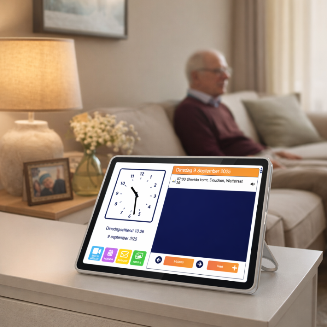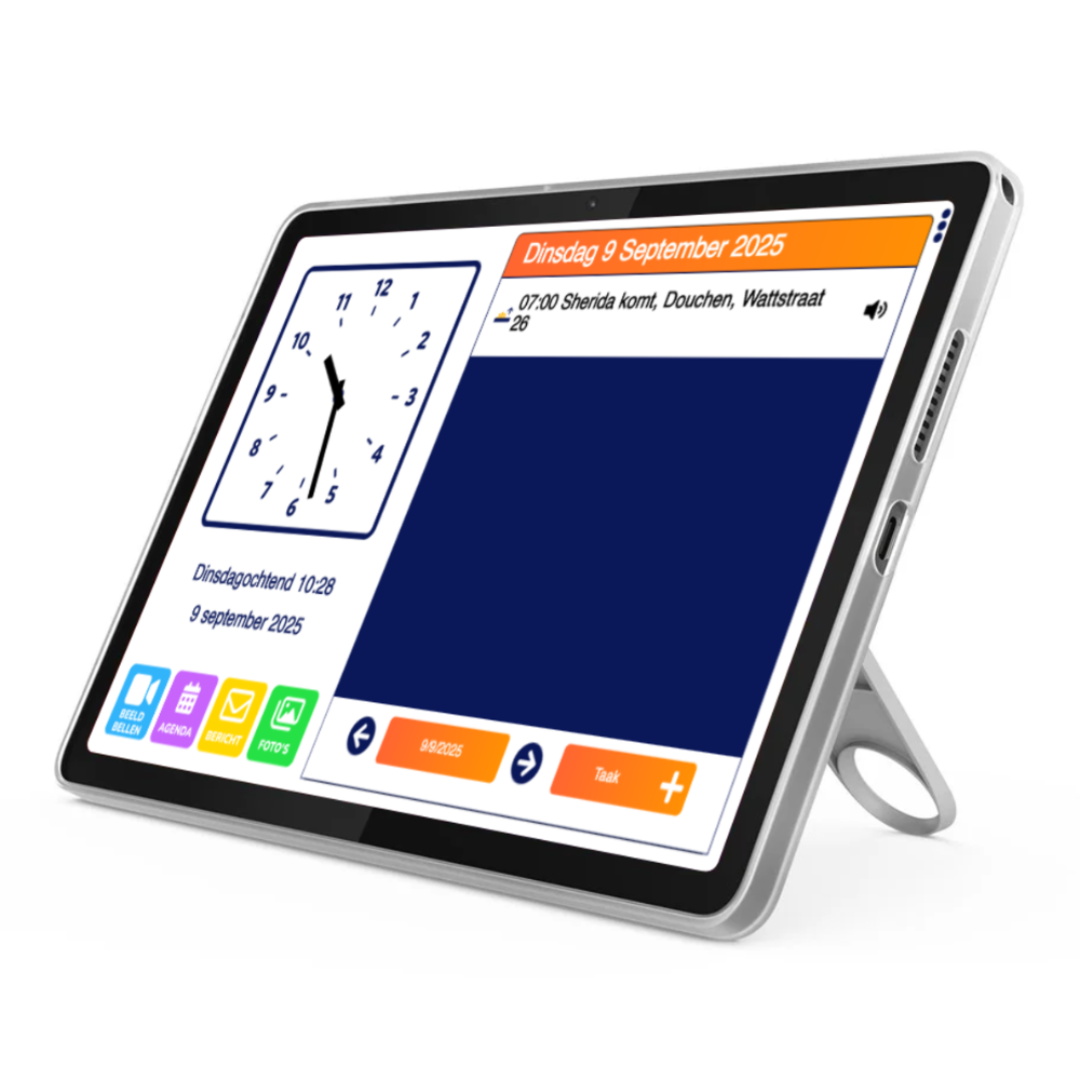 De Dagwijzer is een slim scherm met klok, agenda en beeldbelmogelijkheid in één. Biedt structuur, tijdsbesef en eenvoudige communicatie met familie via de beheer app. Ideaal voor zelfstandig thuis wonen.