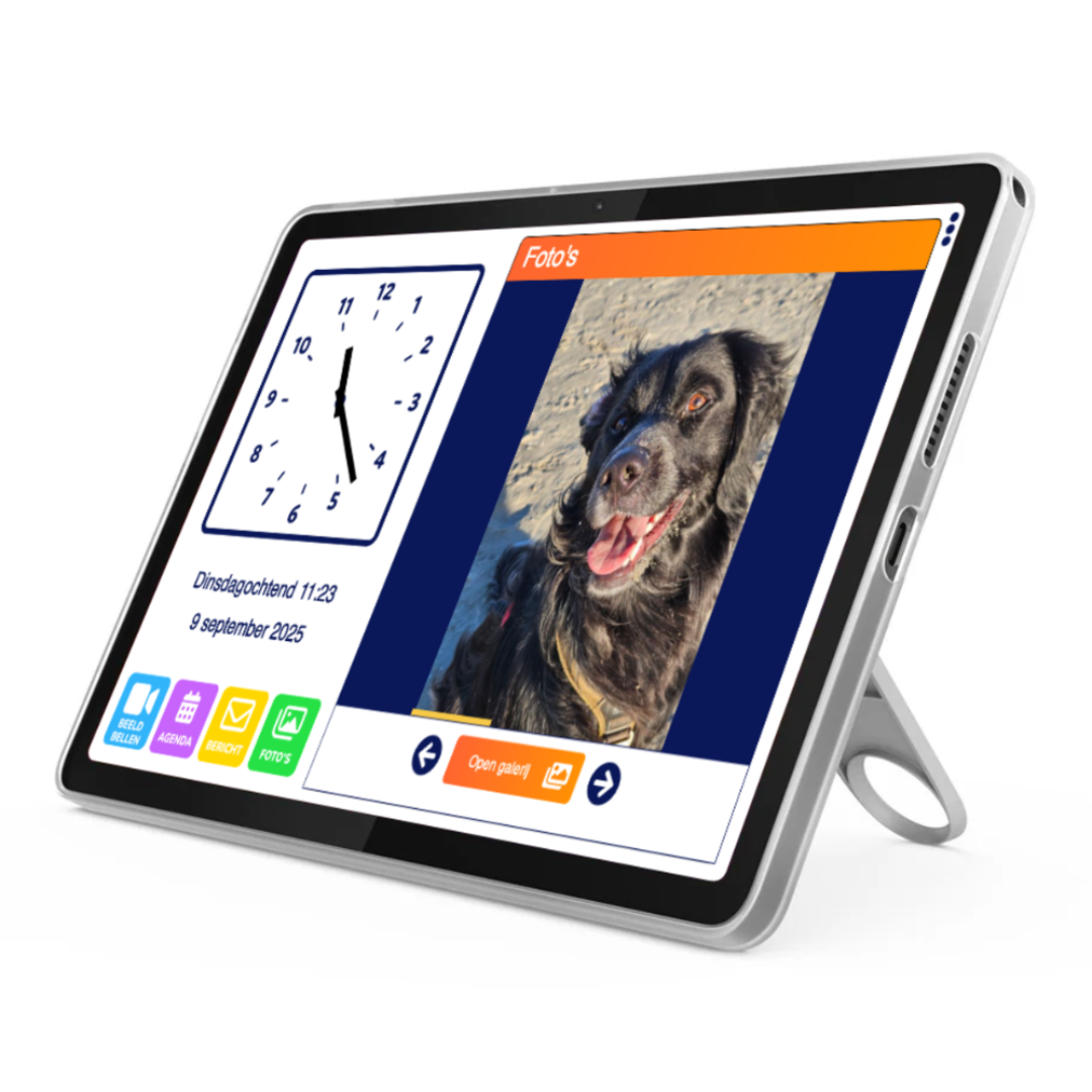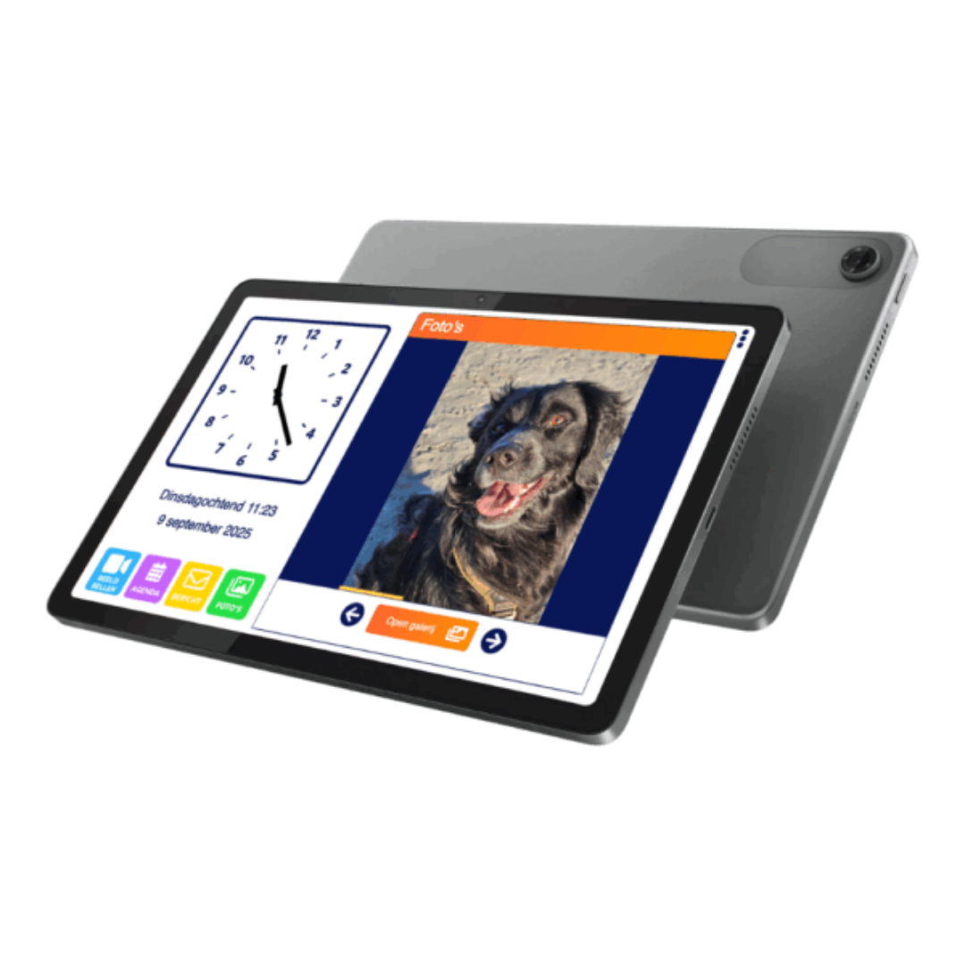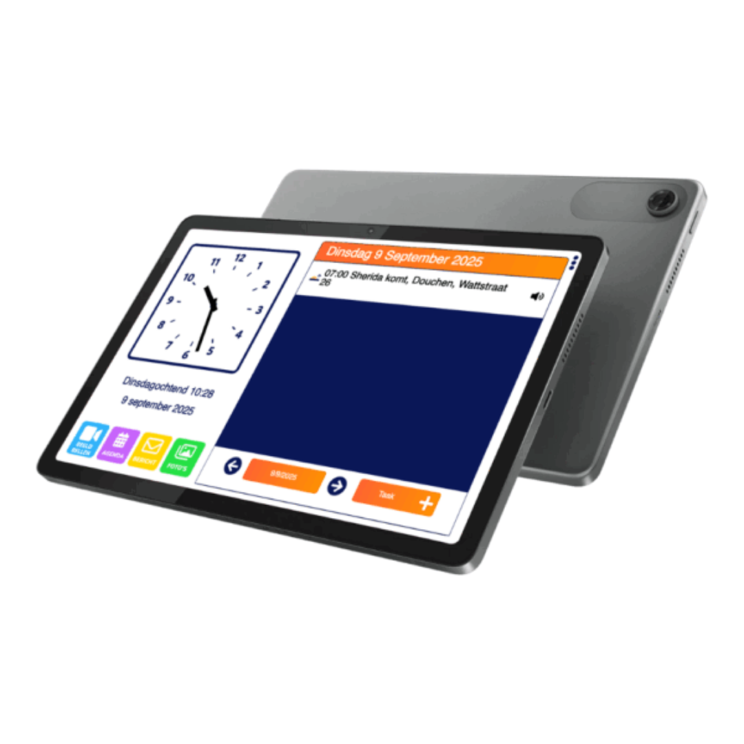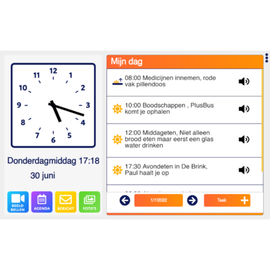 De Dagwijzer is een slim scherm met klok, agenda en beeldbelmogelijkheid in één. Biedt structuur, tijdsbesef en eenvoudige communicatie met familie via de beheer app. Ideaal voor zelfstandig thuis wonen.