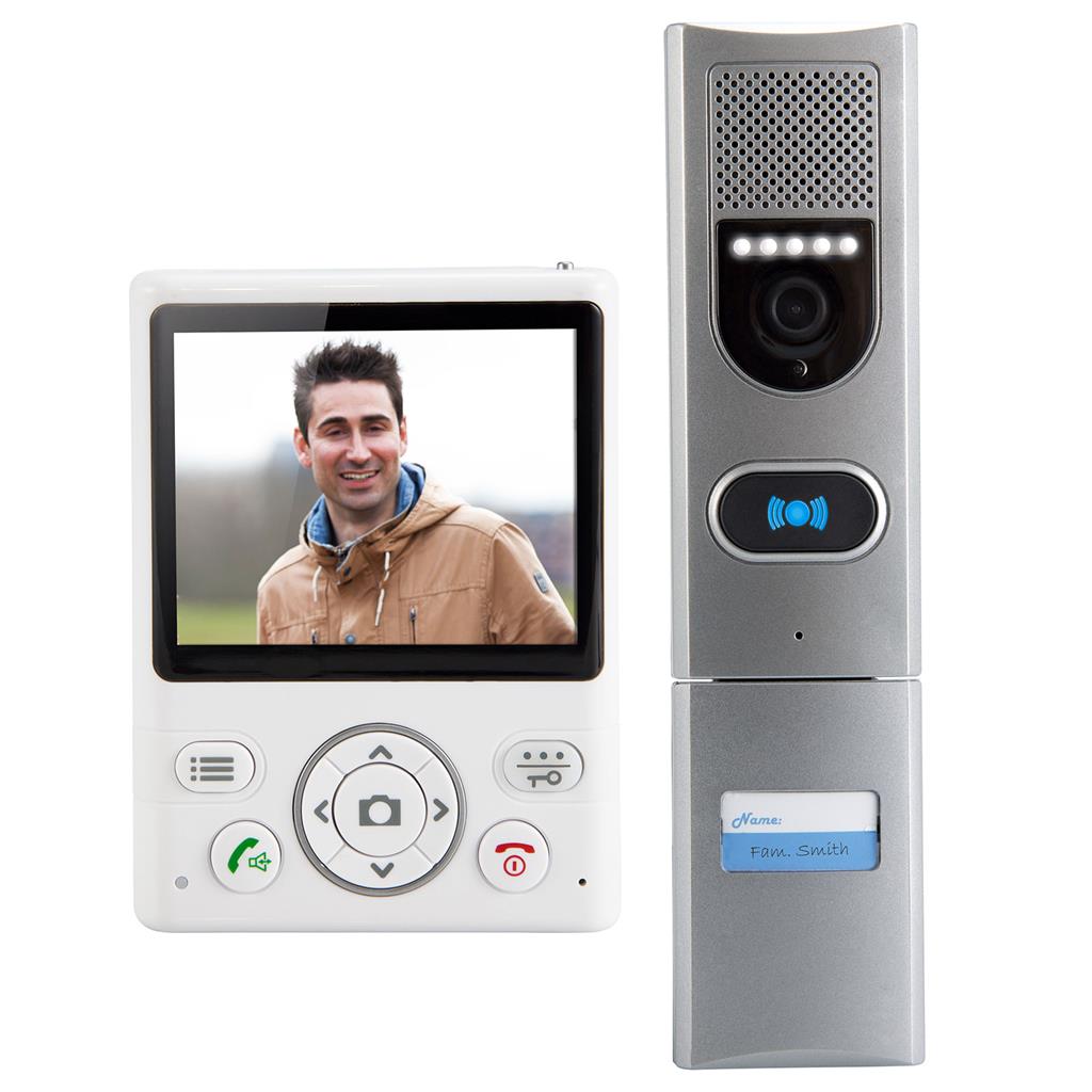 Zie direct wie er voor de deur staat met de deurintercom FDC-250 met camera van Fysic. De intercom is eenvoudig aan te sluiten op de bestaande bedrading van je deurbel, maar je kan de FDC-250 ook op een willekeurige plaats met de meegeleverde batterijen bevestigen. De draadloze verbinding tussen de deurbel en ontvanger is 50 meter en met het 3.5 inch kleurenscherm op de ontvanger zie je wie voor de deur staat. De ingebouwde speaker en microfoon maakt het mogelijk dat je kunt communiceren met degene die voor de deur staat. De camera maakt automatisch een foto met daarbij de datum en tijdstip, bij elke keer dat iemand belt. De FDC-250 is erg handig en veilig. Weet wie er voor je de deur staat!