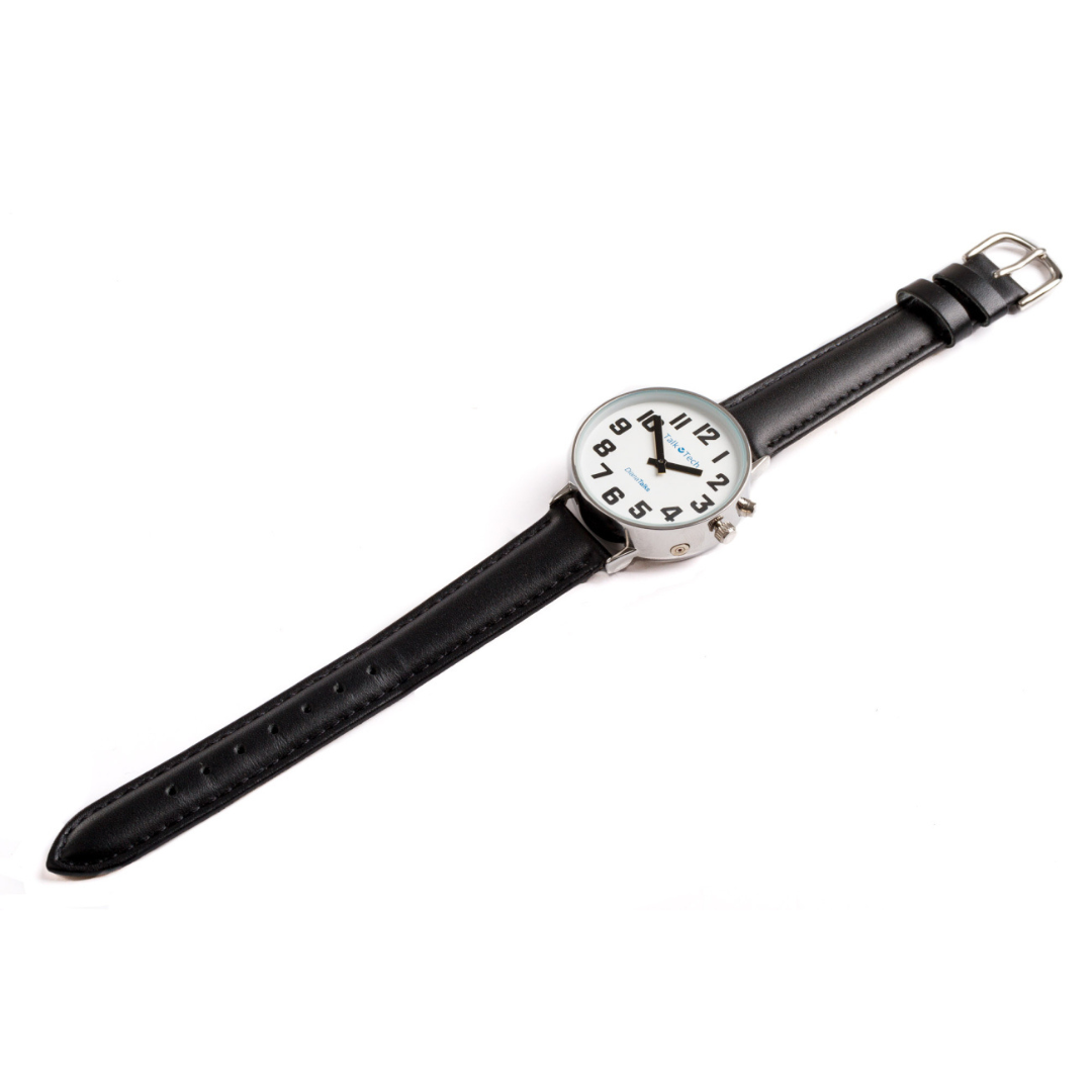 De DianaTalks Prime Large is een compact en gebruiksvriendelijk sprekend horloge, ontworpen voor iedereen die graag snel en duidelijk de tijd wil horen—ideaal voor mensen met een visuele beperking. Het horloge heeft een stijlvolle uitstraling dankzij de chroomkleurige behuizing, aangevuld met een elegante zwarte leren polsband. De witte wijzerplaat van 37 mm, voorzien van zwarte cijfers en wijzers, zorgt voor een optimale leesbaarheid.