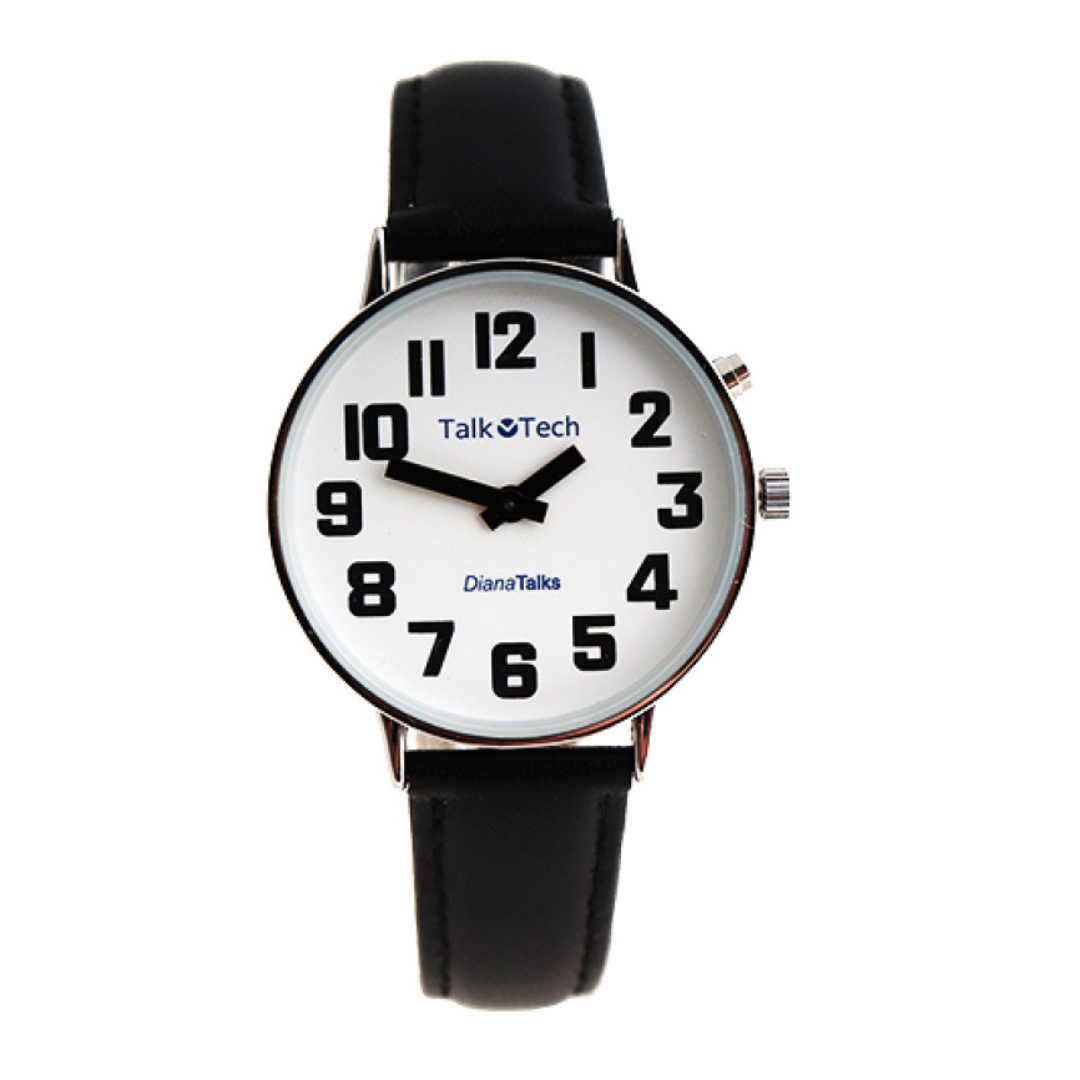De DianaTalks Prime Small is een compact en gebruiksvriendelijk sprekend horloge, ontworpen voor iedereen die graag snel en duidelijk de tijd wil horen—ideaal voor mensen met een visuele beperking. Het horloge heeft een stijlvolle uitstraling dankzij de chroomkleurige behuizing, aangevuld met een elegante zwarte leren polsband. De witte wijzerplaat van 33 mm, voorzien van zwarte cijfers en wijzers, zorgt voor een optimale leesbaarheid.