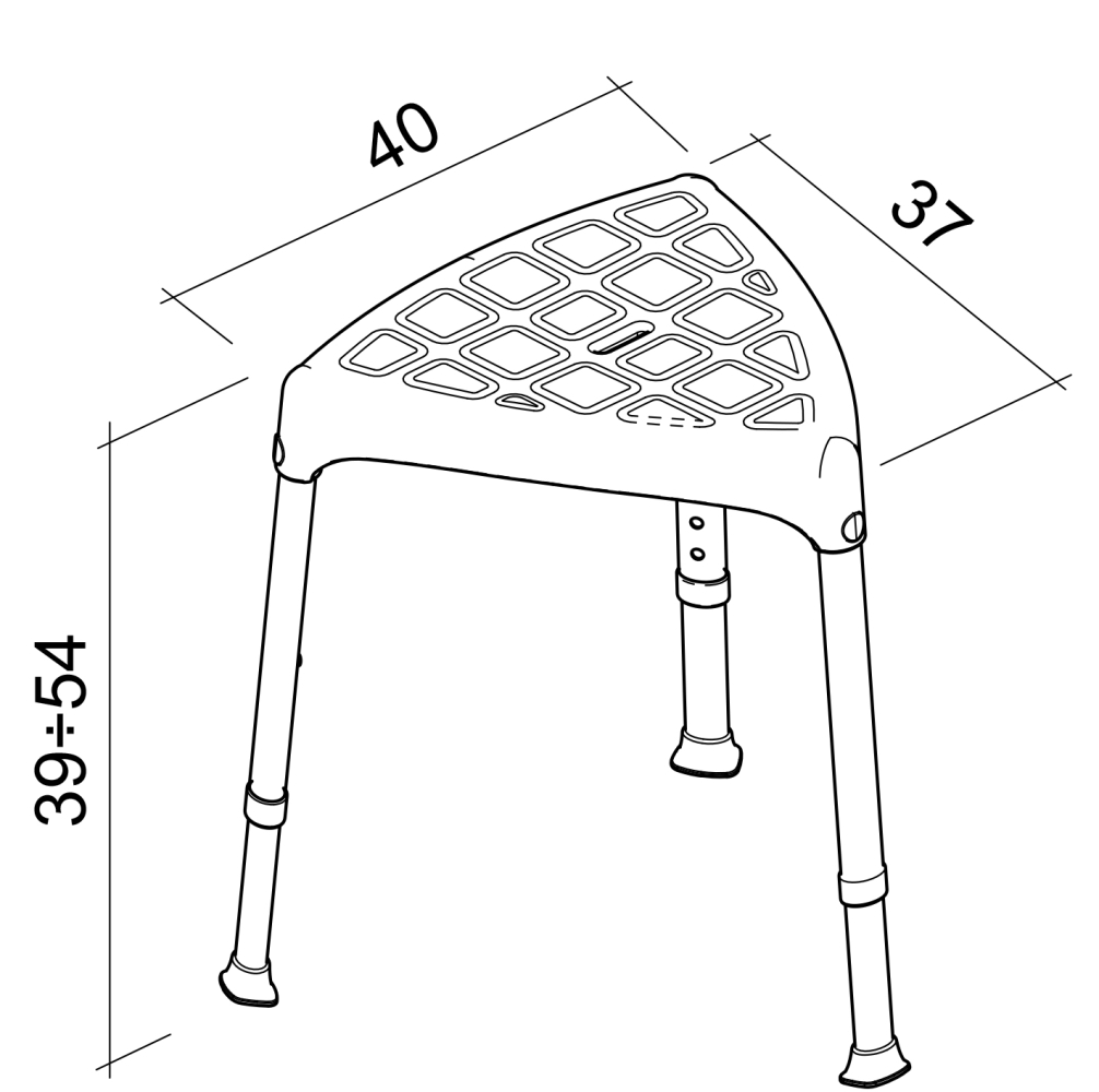 Deze driehoekige douchekruk is verkrijgbaar in een vaste (43 cm) en verstelbare hoogte (39 – 54 cm). Een zachte zitting is los verkrijgbaar.