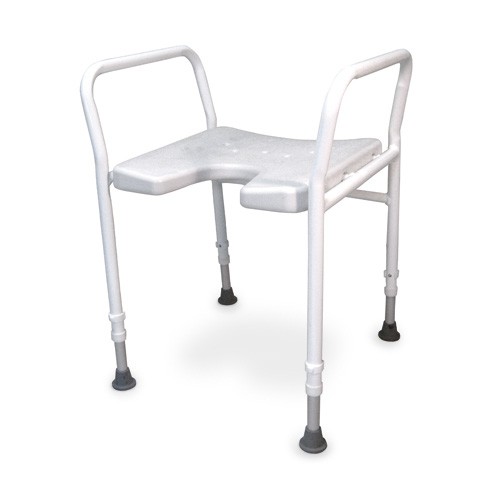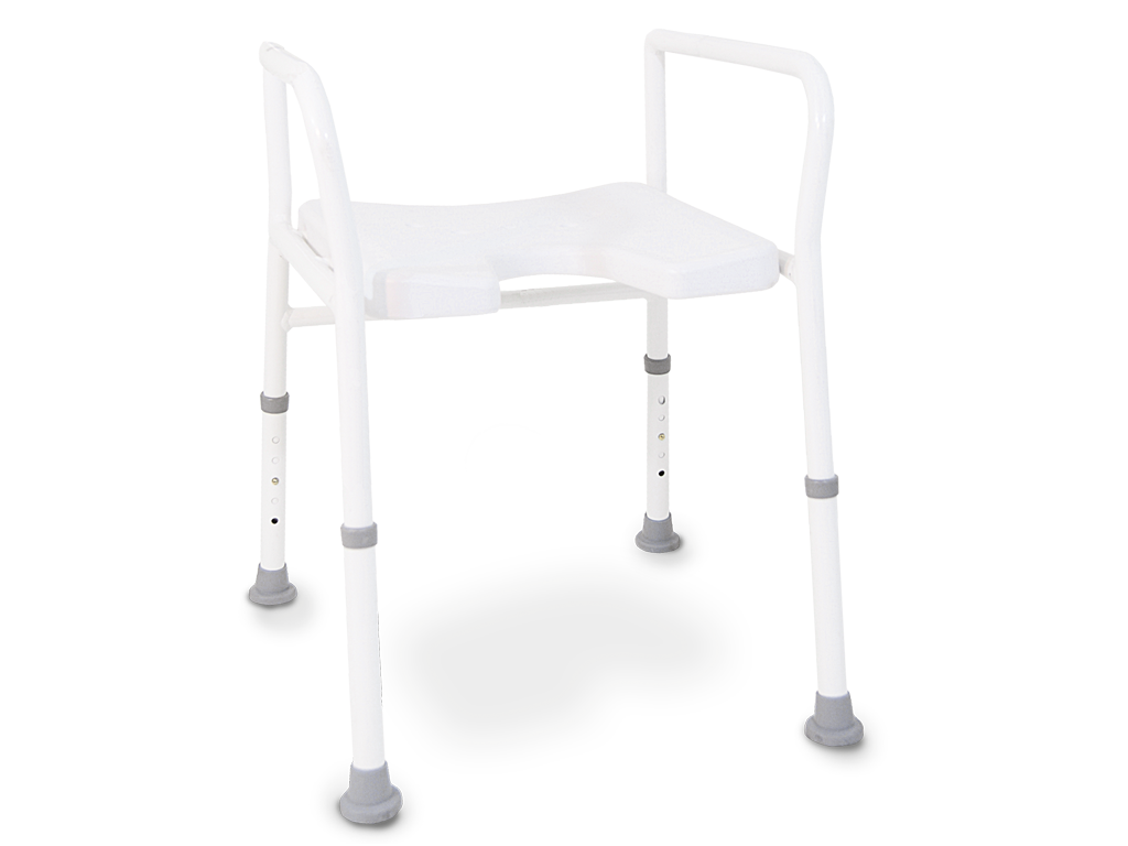 Mooie comfortabele douchestoel voorzien van armsteunen aan beide kanten. Deze stoel is ook ontzettend sterk en stabiel en anti slip. Aan de onderkant van de poten zitten rubberen dopjes die de anti slip waarborgen. Het stoeltje heeft ook een hygiëne uitsparing en waterafvoer.
