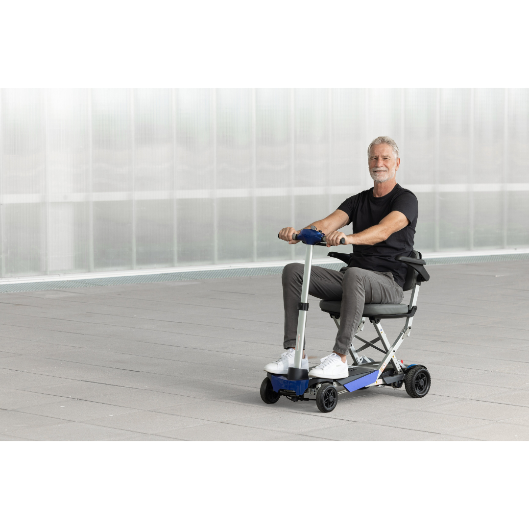 Met een compact vouwformaat van 67 × 41 × 54,5 cm past deze scootmobiel in vrijwel elke kofferbak. Dankzij het gewicht van slechts 19,8 kg zonder accu is hij licht genoeg om op te tillen en op te bergen.