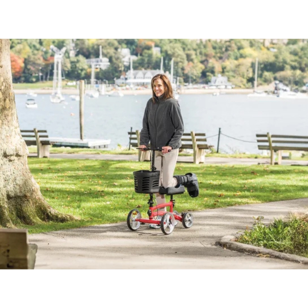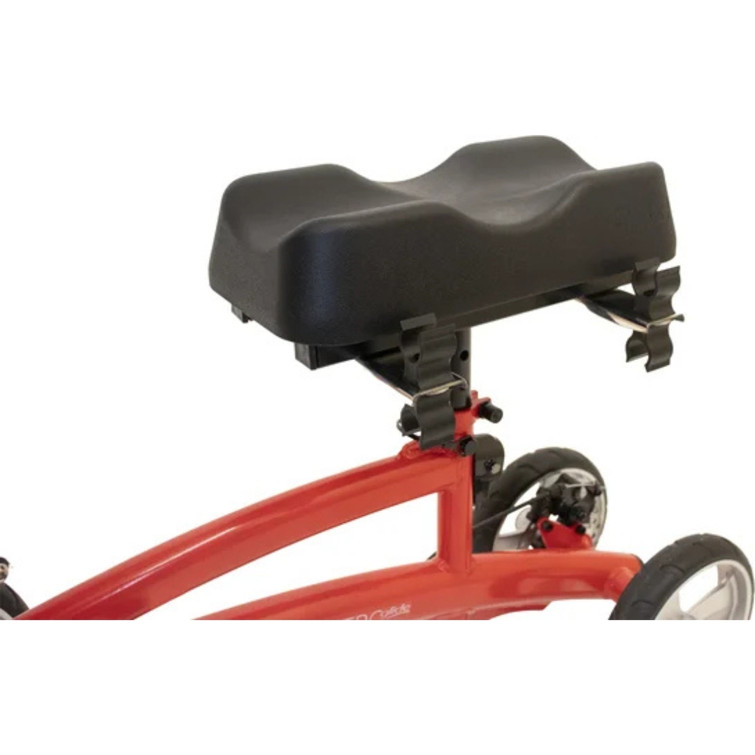 Het robuuste, roestbestendige frame heeft een sportief design en biedt uitstekende stabiliteit. Het ergonomisch gevormde kniekussen zorgt voor comfort, terwijl het verstelbare stuur met handmatige rem en parkeerrem optimale controle biedt. De Smartsoft banden garanderen een soepele rit, en het stuur is opvouwbaar voor eenvoudig transport. Krukken kunt u gemakkelijk meenemen dankzij de optionele krukhouders, en het verwijderbare mandje maakt het eenvoudig om uw spullen mee te nemen.