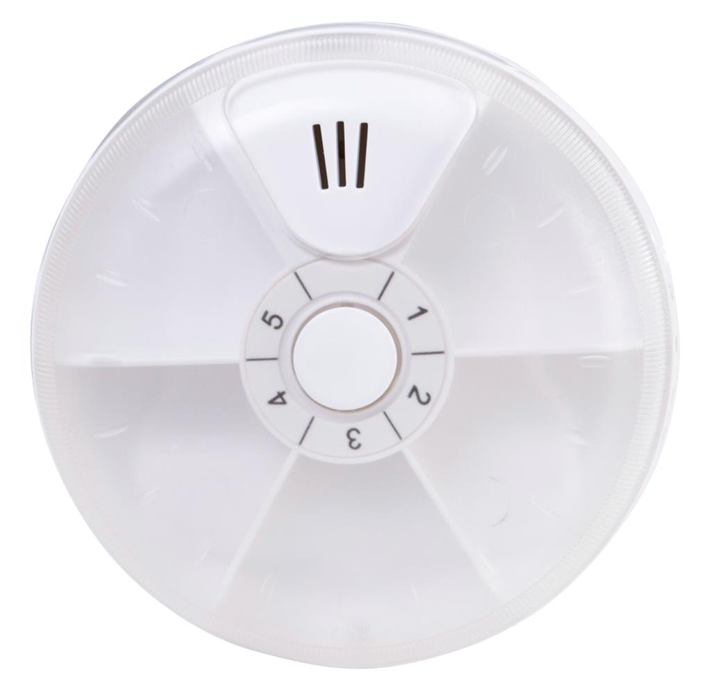 Het FC-55 elektronische pillendoosje bestaat uit een vijftal compartimentjes waarin u uw medicijnen verdeelt op volgorde van inname. In vakje 1 komen de eerste medicijnen, in vakje 2 de volgende enzovoort. U kunt voor elk compartimentje een alarmtijd instellen. Als het medicatiemoment is aangebroken zal de FC-55 dat door middel van een geluidsalarm, trillingen of beide laten weten. U draait het dekseltje van het pillendoosje naar het compartiment waarin de medicijnen voor dat moment zitten en het alarm stopt met signaleren. Als u het moment mist zal hij u er 5 én 10 minuten later nogmaals aan herinneren. Zo vergeet u nooit meer uw medicatie op het juiste moment in te nemen.