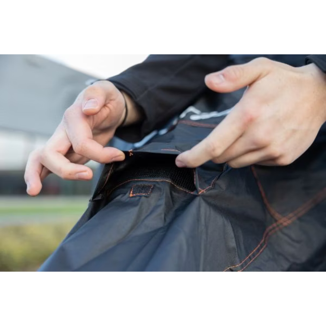 De fietshoes is voorzien van uitneembare spiegelzakken, ventilatieluikjes aan de voor- en achterzijde om condensvorming te beperken en een opening bij het voorwiel voor het plaatsen van een extra slot.
