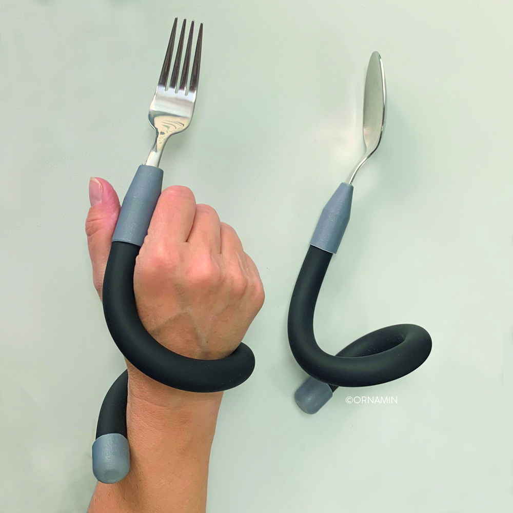Het bestek is gemaakt van roestvrij staal. Het handvat is gemaakt van siliconen, waardoor deze gemakkelijk in elke gewenste vorm gebogen kan worden. Hierdoor zijn er veel posities mogelijk voor het vasthouden van het bestek, waardoor zelfstandig eten weer mogelijk wordt voor mensen met allerlei aandoeningen.