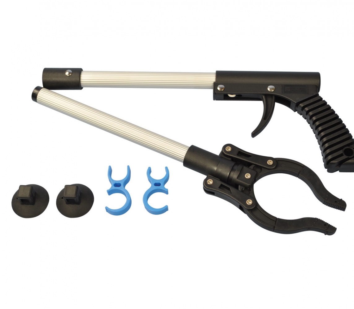 Door de bijgeleverde zuignapjes aan de klem te bevestigen creëert u een grijper met zuignappen. U kunt de grijper aan elkaar of aan een rollator of rolstoel bevestigen met de meegeleverde klemmetjes. Dan heeft u de grijper altijd bij zich.
