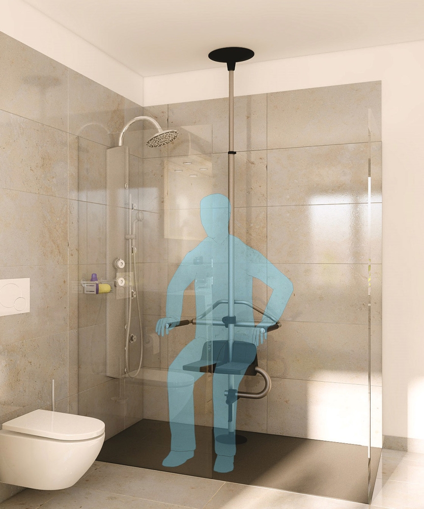 Biedt ondersteuning bij het opstaan en gaan zitten. Wordt vaak gecombineerd met het opklapbare douchezitje. De armsteunen zijn voorzien van een comfortabele rubberen laag. Inclusief universele connector voor bevestiging aan de grijppaal.