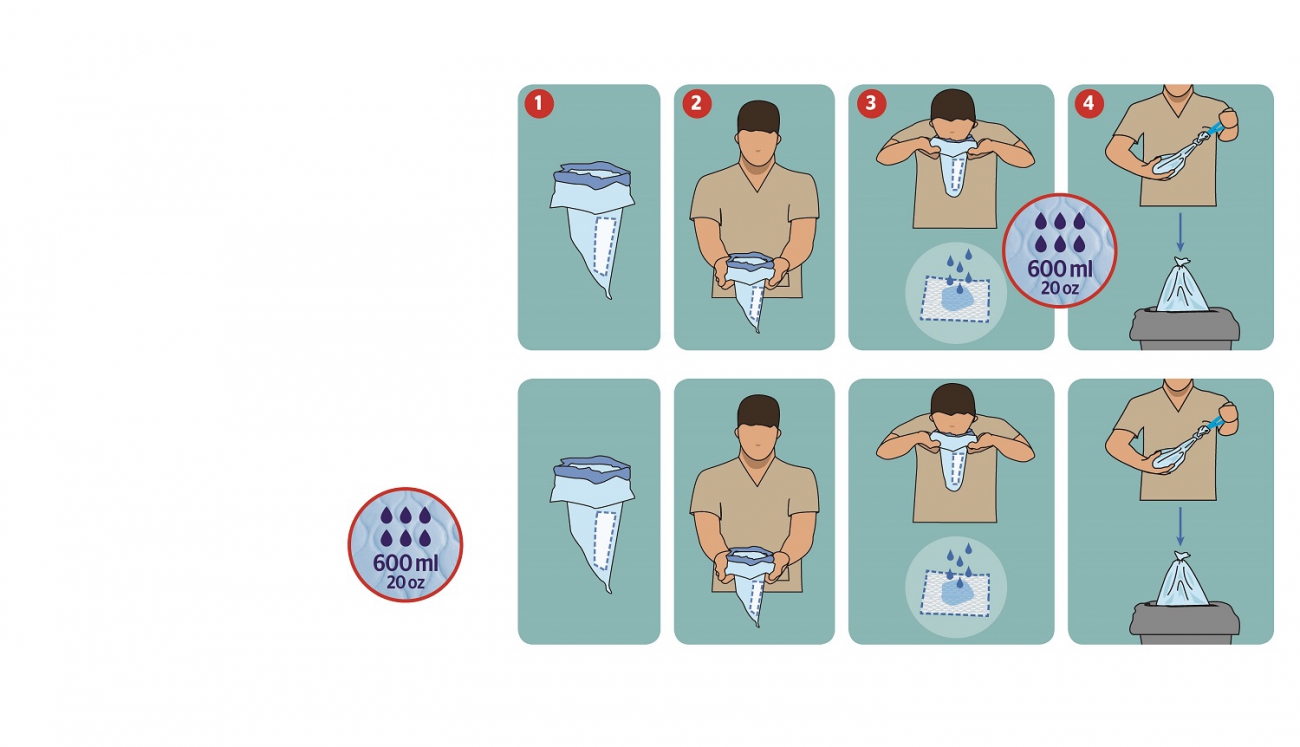 • Gepatenteerde geïntegreerde houder aan de urine- en braakselopvangzak; bescherming van de handen en geen contact met het bevuilde gebied van de opvangzak