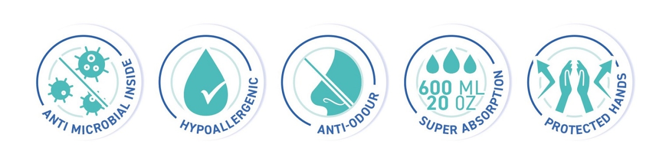 Deze kwalitatieve opvangzakken zorgen voor een veilige en hygiënische opvang van urine, ontlasting en braaksel. De opvangzakken zijn voorzien van super absorberende inleggers die de uitscheiding omzet in een vaste gel (600 ml) en die tevens de geur neutraliseert.