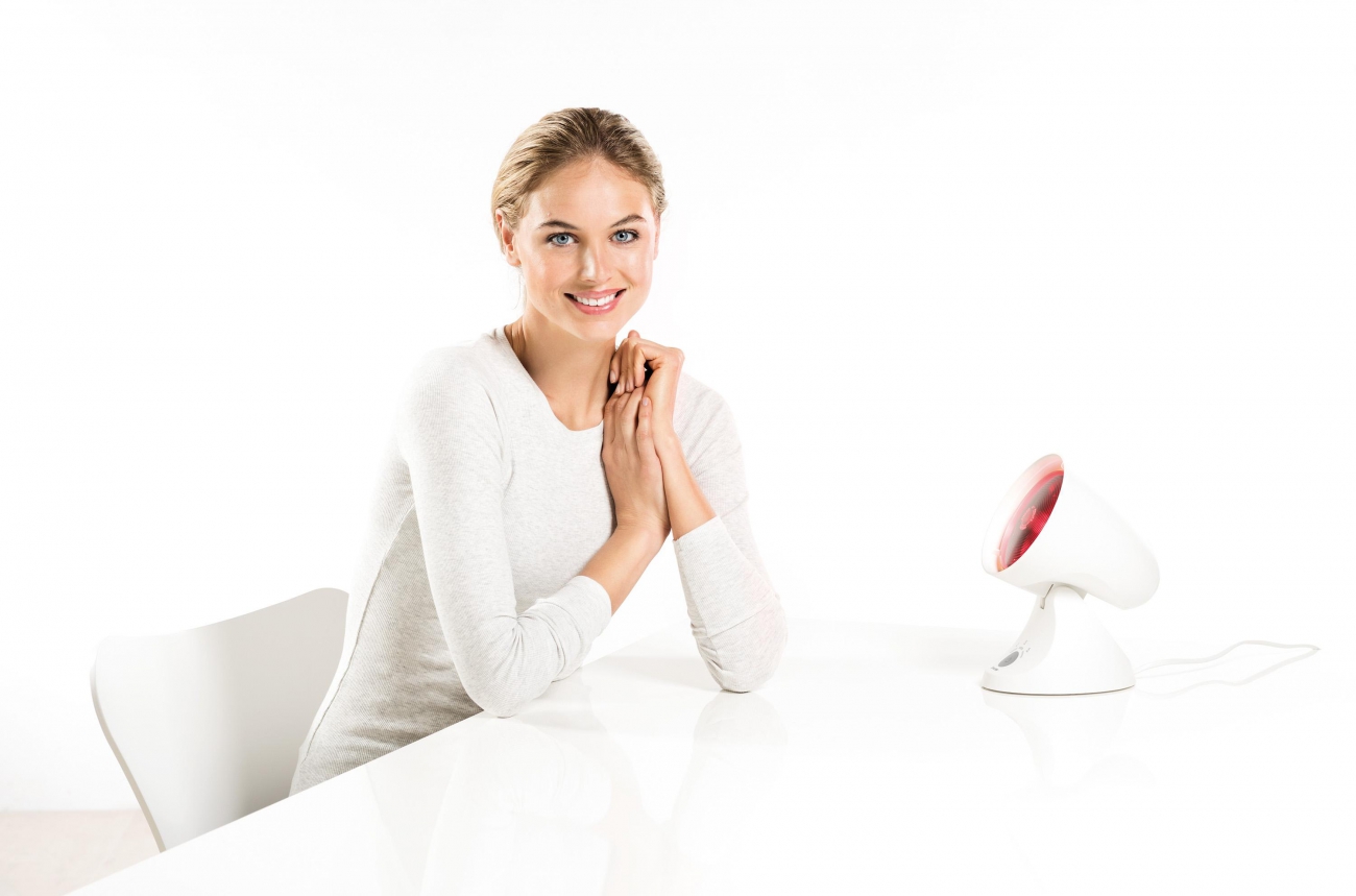 Aangename infrarood warmte. Solide geperste glazen bol, verstelbare kop: 5 instelhoeken.