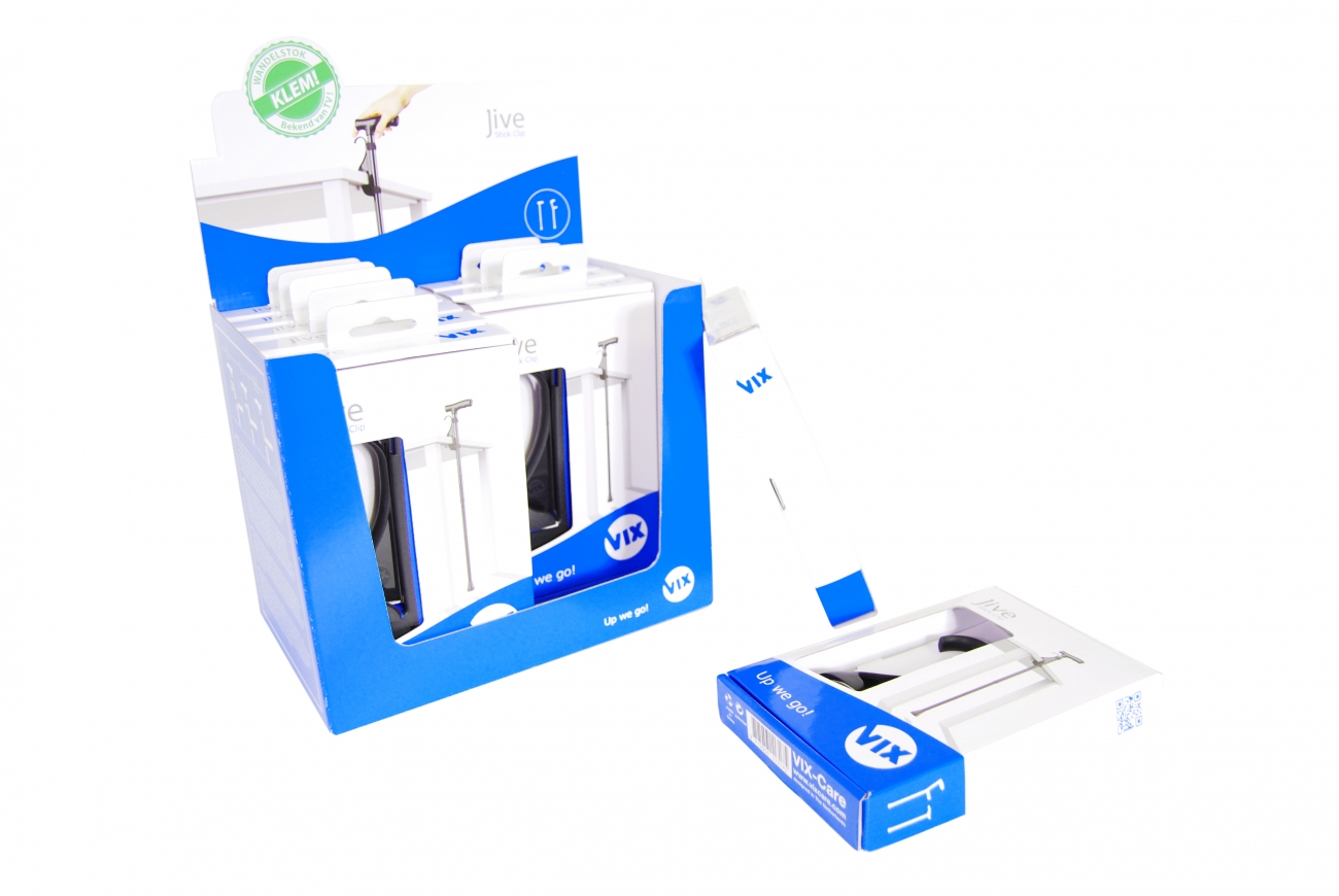 De Jive is een wandelstok klem, waarmee de wandelstok of elleboogkruk eenvoudig aan een tafelblad (maximaal 45 mm) geklemd kan worden.