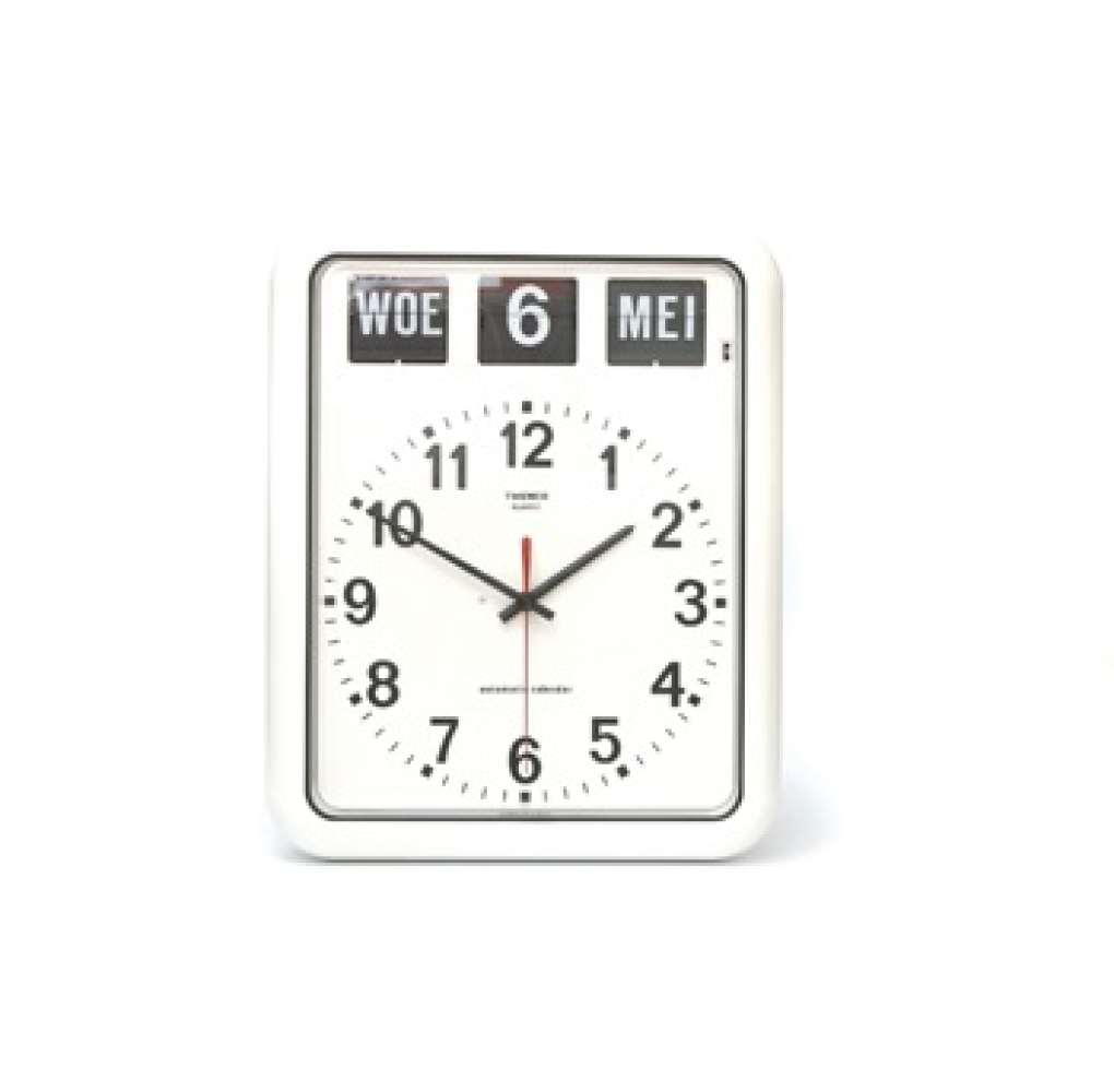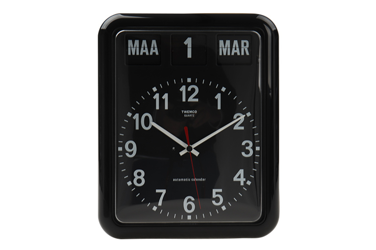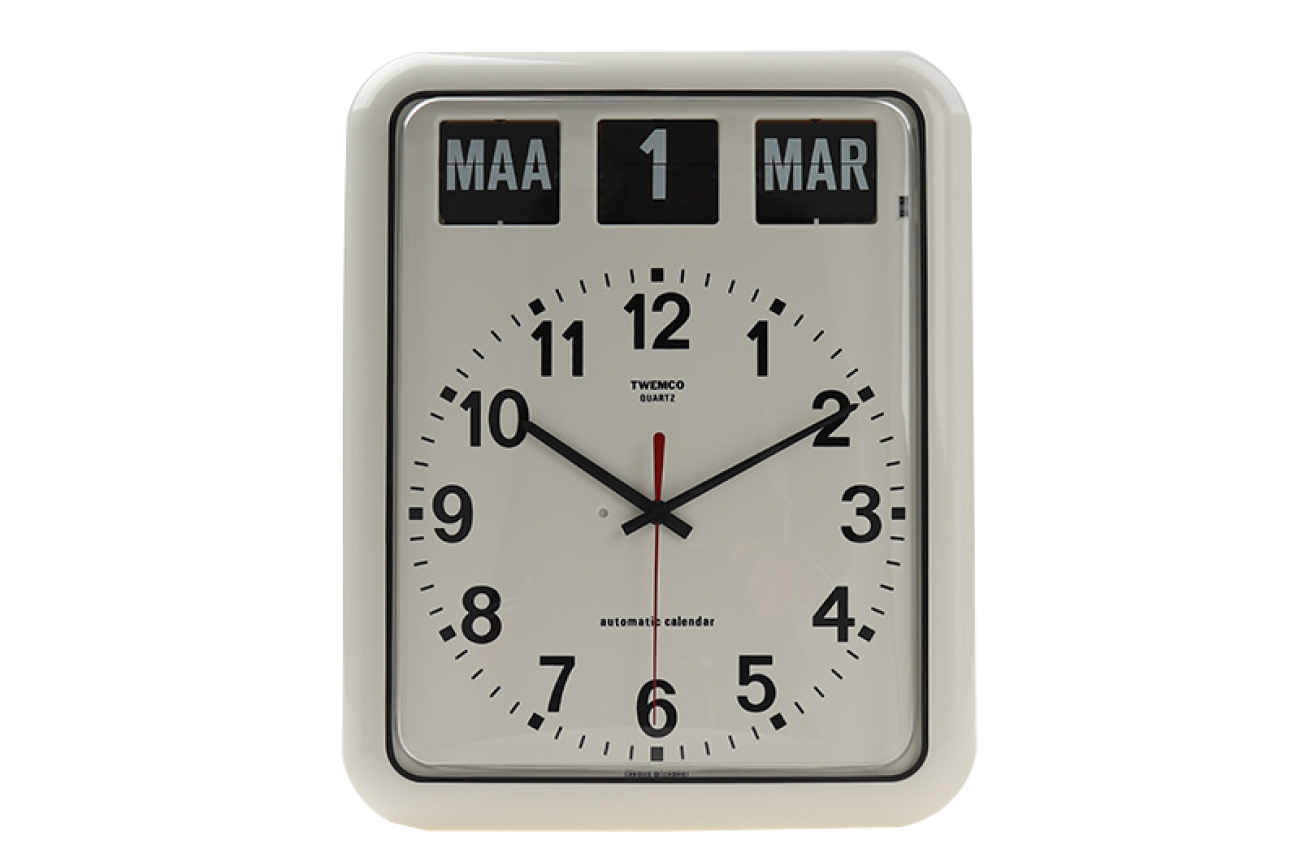 Grote Twemco kalenderklok voor slechtzienden. Dit wandmodel heeft een grote, witte, analoge wijzerplaat, zwarte wijzers en 12 zwarte cijfers van 3 cm hoog. De kalenderaanduiding (dag, datum en maand) heeft witte, digitale valletters van 2,5 cm hoog op een zwarte achtergrond. Nederlandse taal.