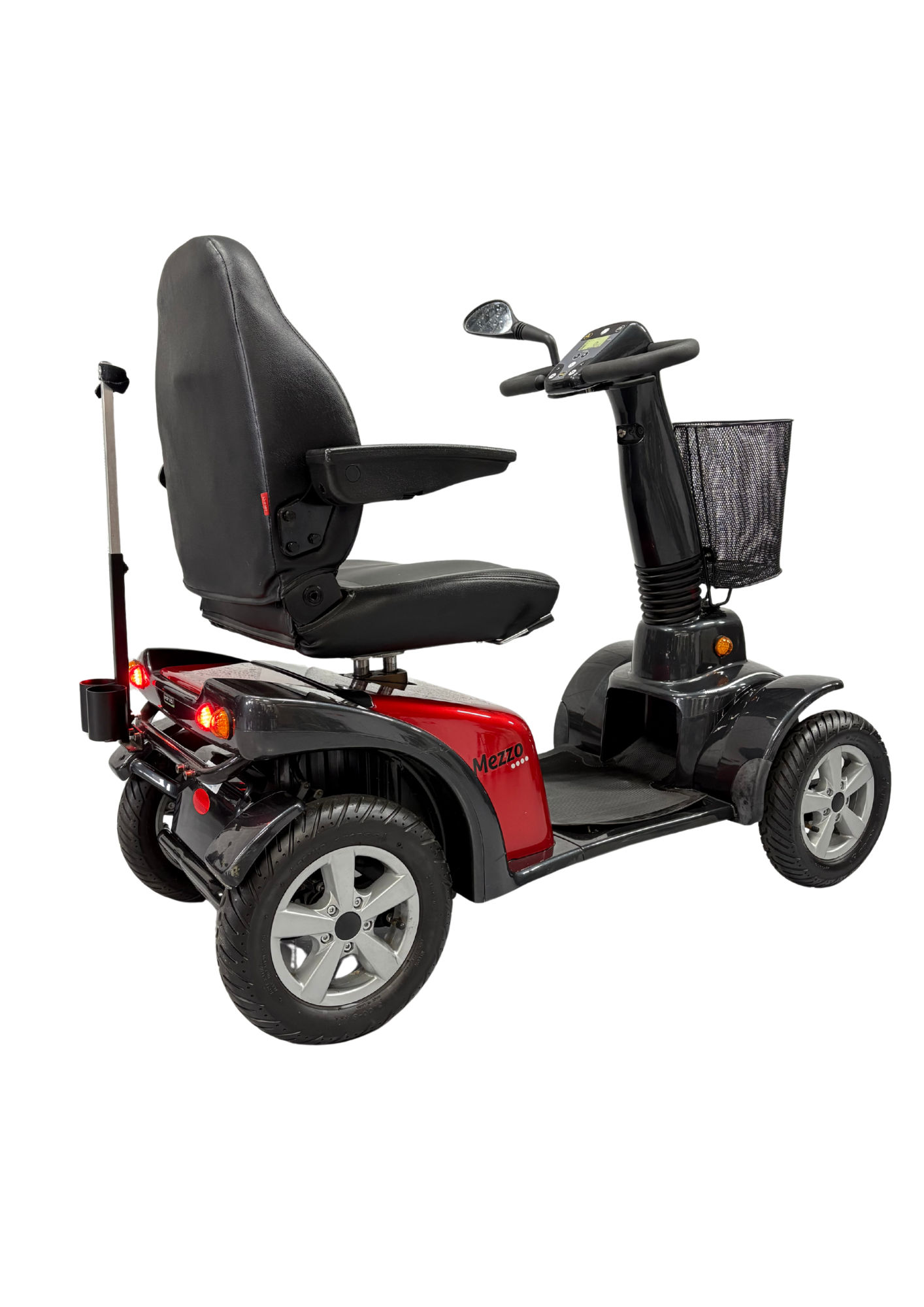 De Life & Mobility Mezzo 4‑wiel biedt een stabiele en comfortabele rijervaring, mede dankzij het unieke INDEGO-veringssysteem op basis van rubber dat oneffenheden effectief opvangt. Deze gebruikte scootmobiel uit 2017 heeft 1.437 km op de teller en vertoont gebruikerssporen, waaronder flinke krassen op het achterspatbord en op de achterkap links achter in de knik naar boven toe.
