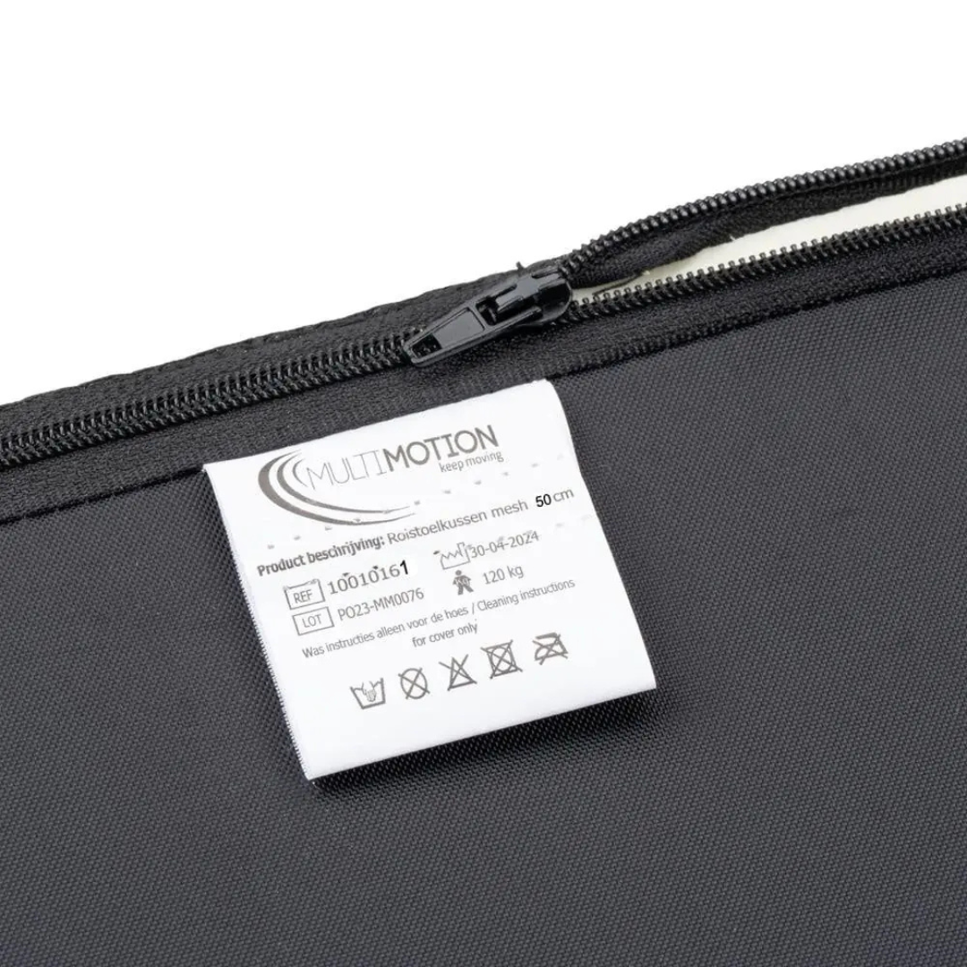 De ademende mesh hoes is voorzien van een ritssluiting, eenvoudig afneembaar en met de hand wasbaar. Aan de onderzijde zijn twee klittenbandstroken aangebracht om het kussen stevig op zijn plaats te houden. Daarnaast wordt een losse plakstrook meegeleverd voor een eventuele vaste bevestiging op de rolstoelzitting.