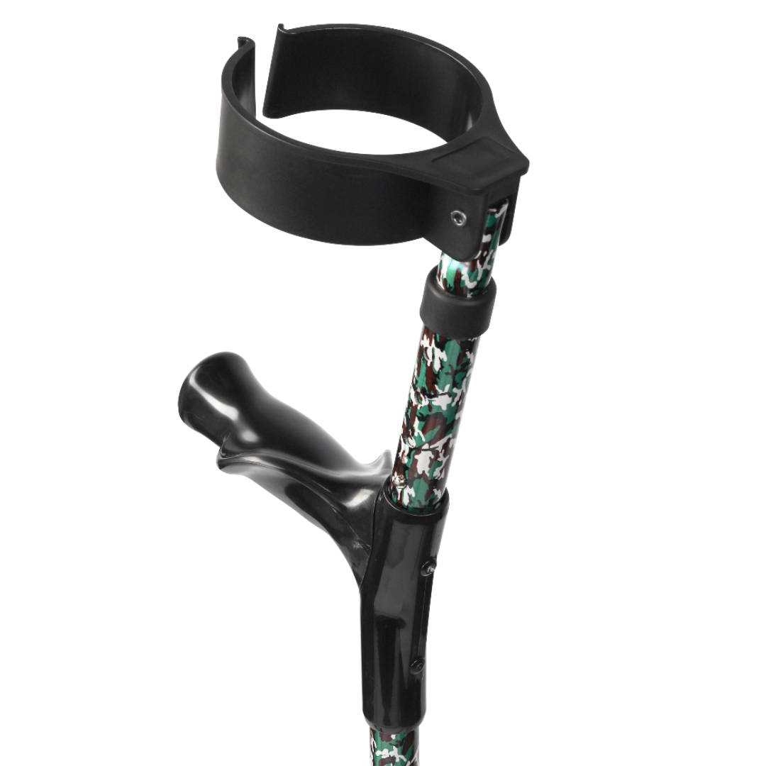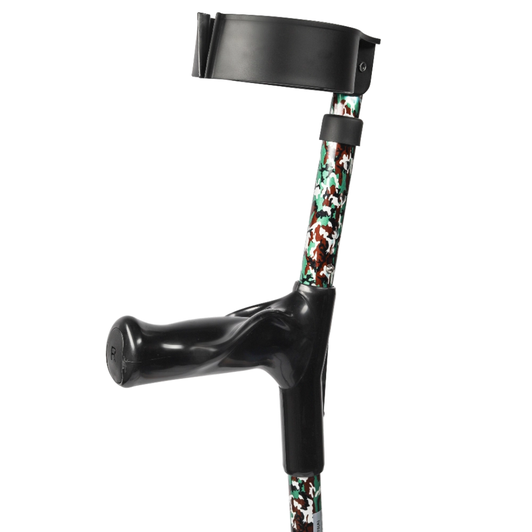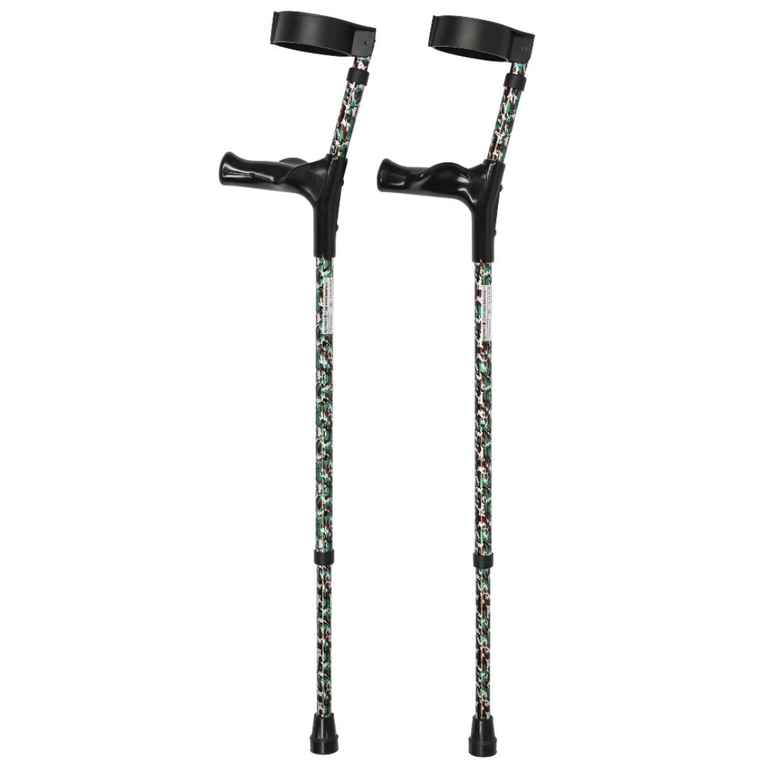 Lichtgewicht anatomische MultiMotion elleboogkrukken in Camouflage. Dubbel verstelbaar, gesloten manchet en geschikt tot 136 kg. Set van 2 voor optimaal loopcomfort.