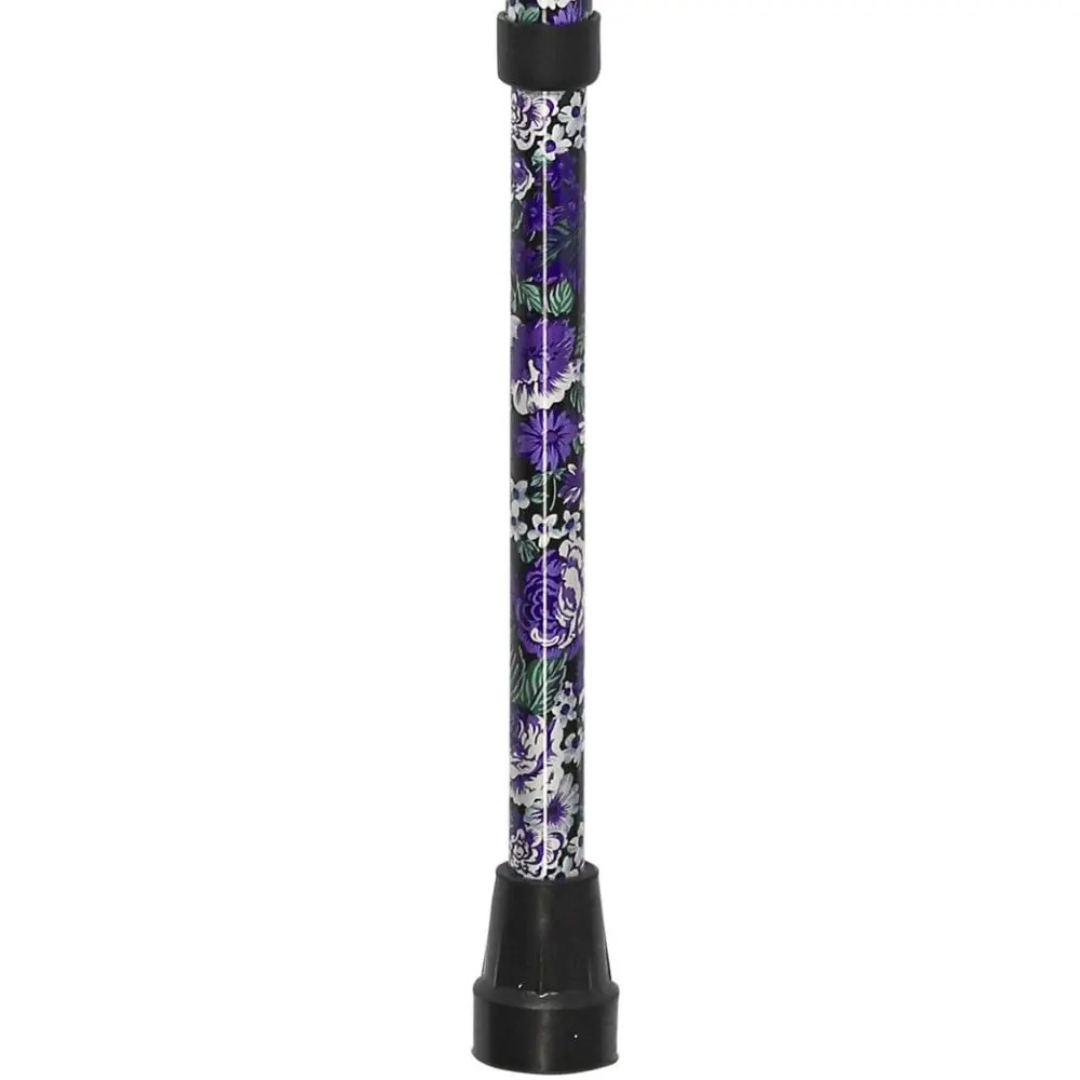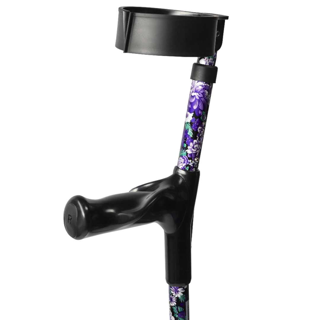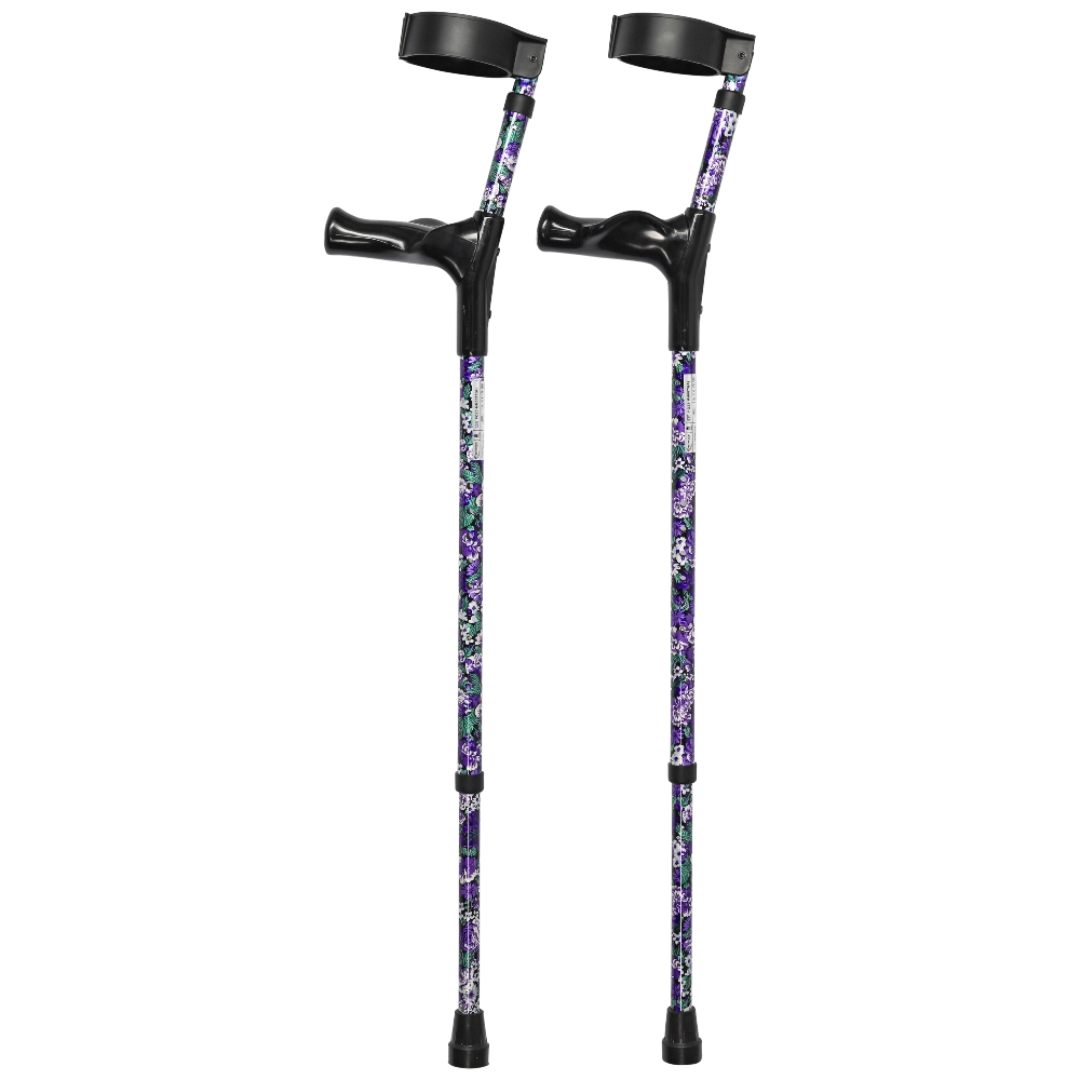 Lichtgewicht anatomische MultiMotion elleboogkrukken in paars met bloemen. Dubbel verstelbaar, gesloten manchet en geschikt tot 136 kg. Set van 2 voor optimaal loopcomfort.