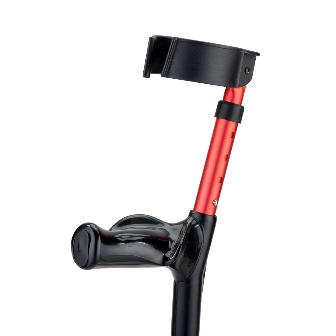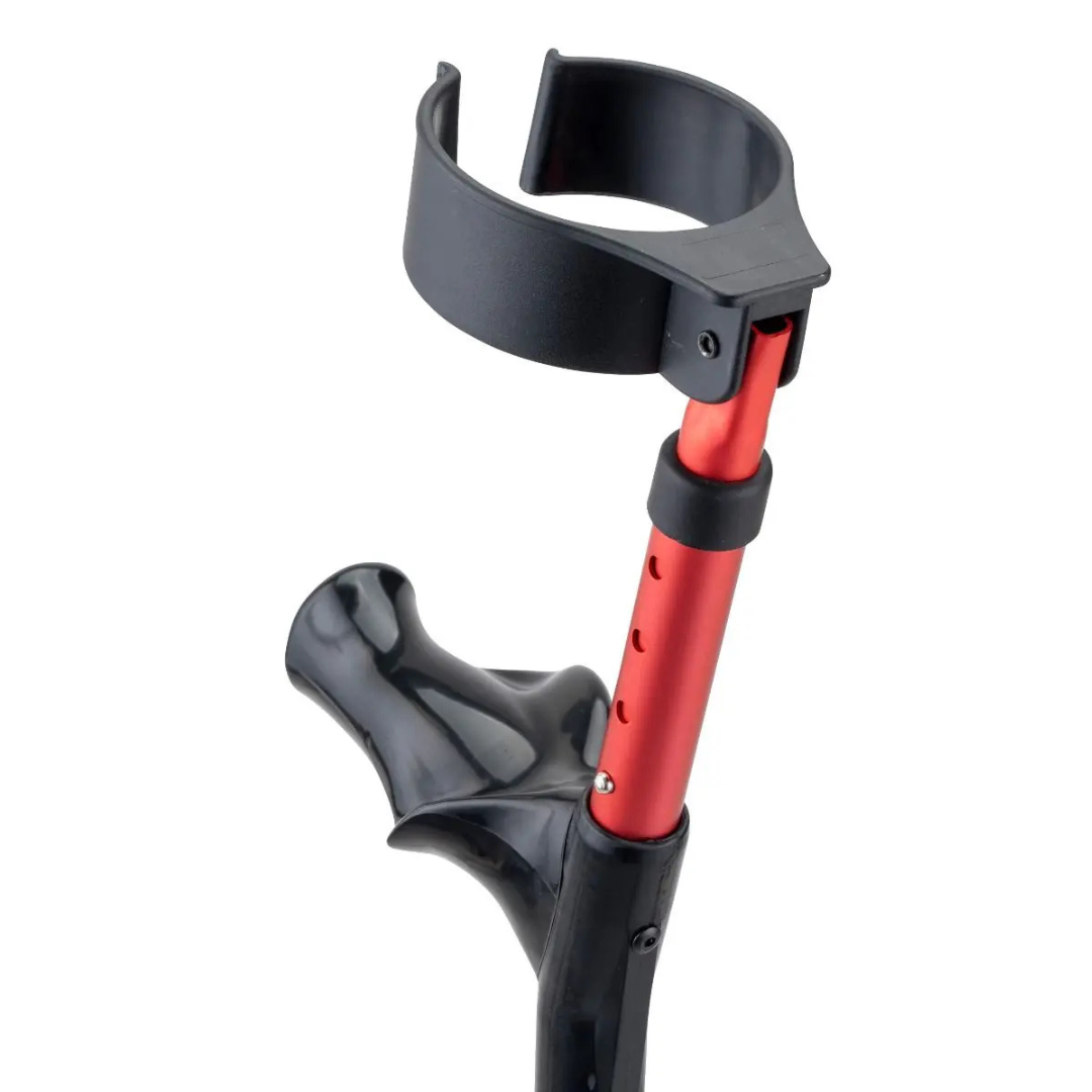 Deze uitvoering is uitgevoerd in een rode kleur en is daarnaast verkrijgbaar in blauw, zwart en roze. De krukken worden geleverd per set: één voor de linker- en één voor de rechterarm.