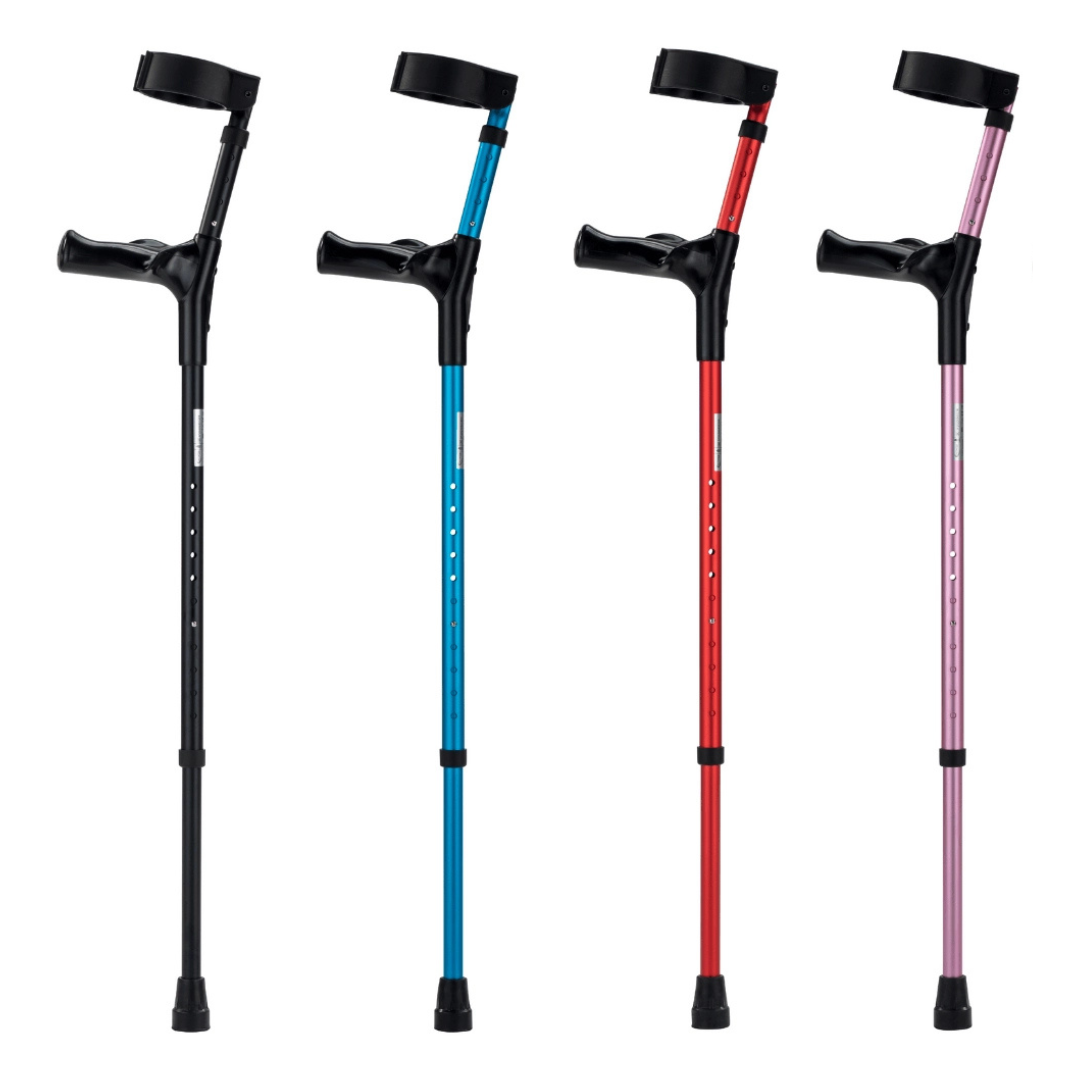 Lichtgewicht anatomische elleboogkrukken van MultiMotion met gesloten manchet en dubbel verstelbare hoogte. Comfortabel, stabiel en geschikt tot 136 kg. Set van 2.