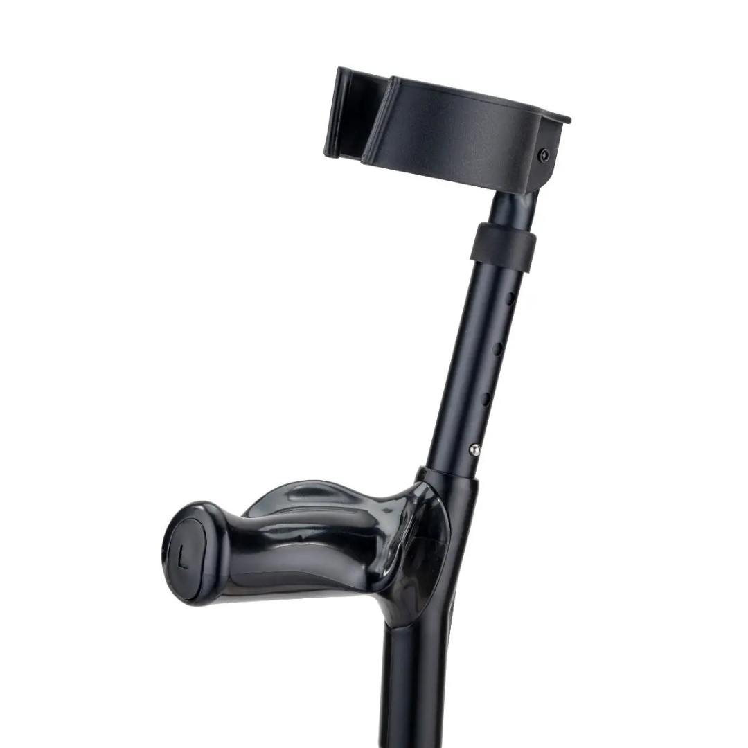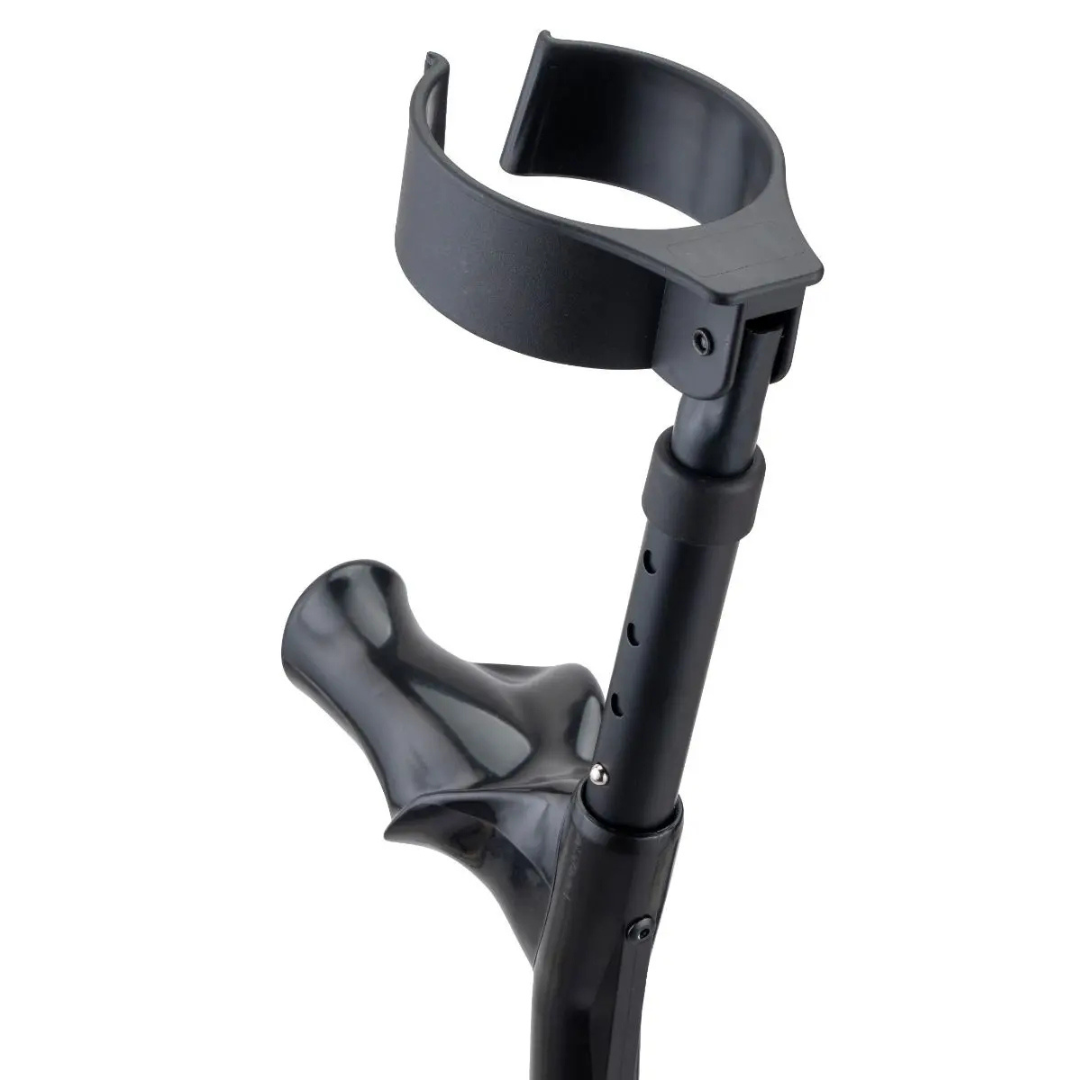 Dankzij het handige kliksysteem stelt u de krukken eenvoudig op de juiste maat af. De gesloten manchet biedt extra stabiliteit en voorkomt wegglijden van de arm, waardoor u meer controle heeft tijdens het lopen.