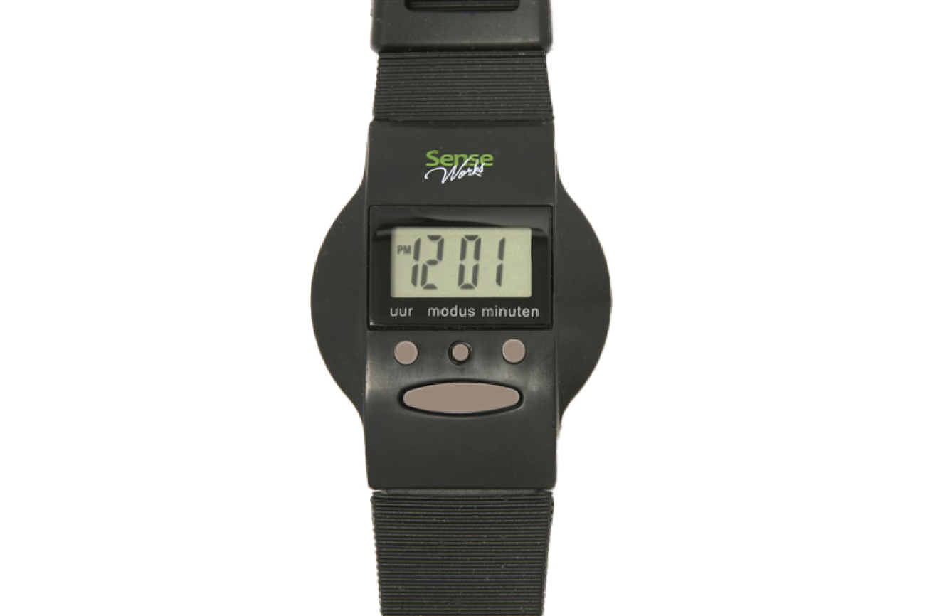 SenseWorks Nederlandssprekend kunststof horloge met digitaal display. Met keuze voor tijd- en alarmuitspraak in 12 of 24 uursklok, bijvoorbeeld: "De tijd is vijf over twaalf in de middag".