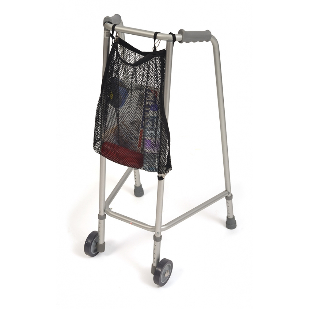 Lichtgewicht nylon boodschappennetje met clipbevestiging voor looprek of rolstoel. Ruim, sterk en belastbaar tot 3 kg—ideaal voor boodschappen en persoonlijke spullen.
