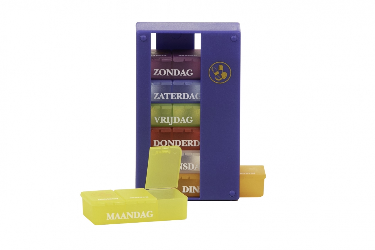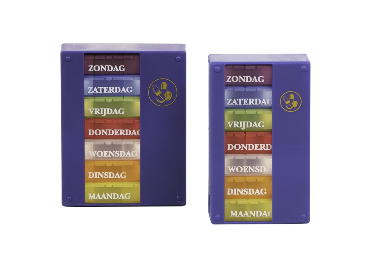 Met de pillenbox 1 week houdt u overzicht over pillen en tabletten die u of iemand anders moet innemen in een bepaalde periode. De pillenbox heeft 7 dagdoosjes voor de zeven dagen van de week. Ieder dagdoosje heeft een aantal vakjes voor bepaalde tijdstippen. Er zijn twee verschillende modellen: 4- vaks en 3-vaks.