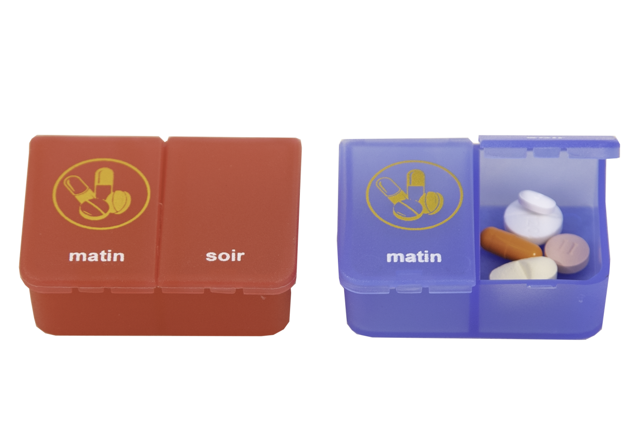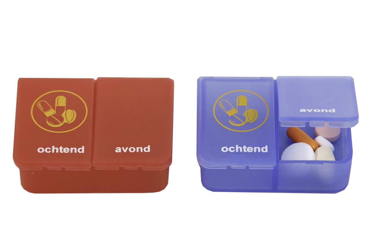 De pillendoos voor 1 dag heeft vakjes voor verschillende tijdstippen op de dag, zoals ochtend, middag, avond en nacht. Er zijn 2 verschillende modellen: 4-vaks en 2-vaks. Verkrijgbaar in twee kleuren: transparant blauw en transparant rood.