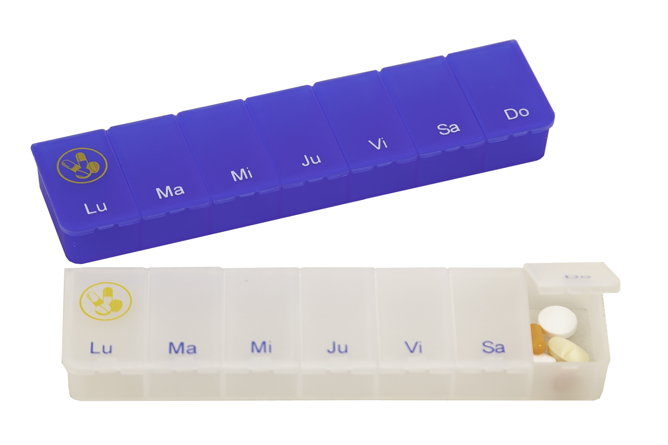 De pillendoos voor 1 week heeft zeven vakjes. Elke dag heeft een eigen vakje. Verkrijgbaar in twee kleuren: transparant blauw en transparant wit.