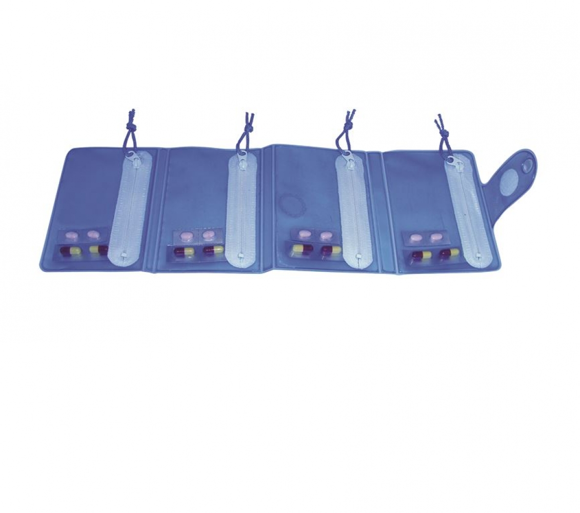 Piltasje met vier vakken voor de ochtend, middag, avond en nacht. Met ritssluiting. Makkelijk op te vouwen en mee te nemen.
