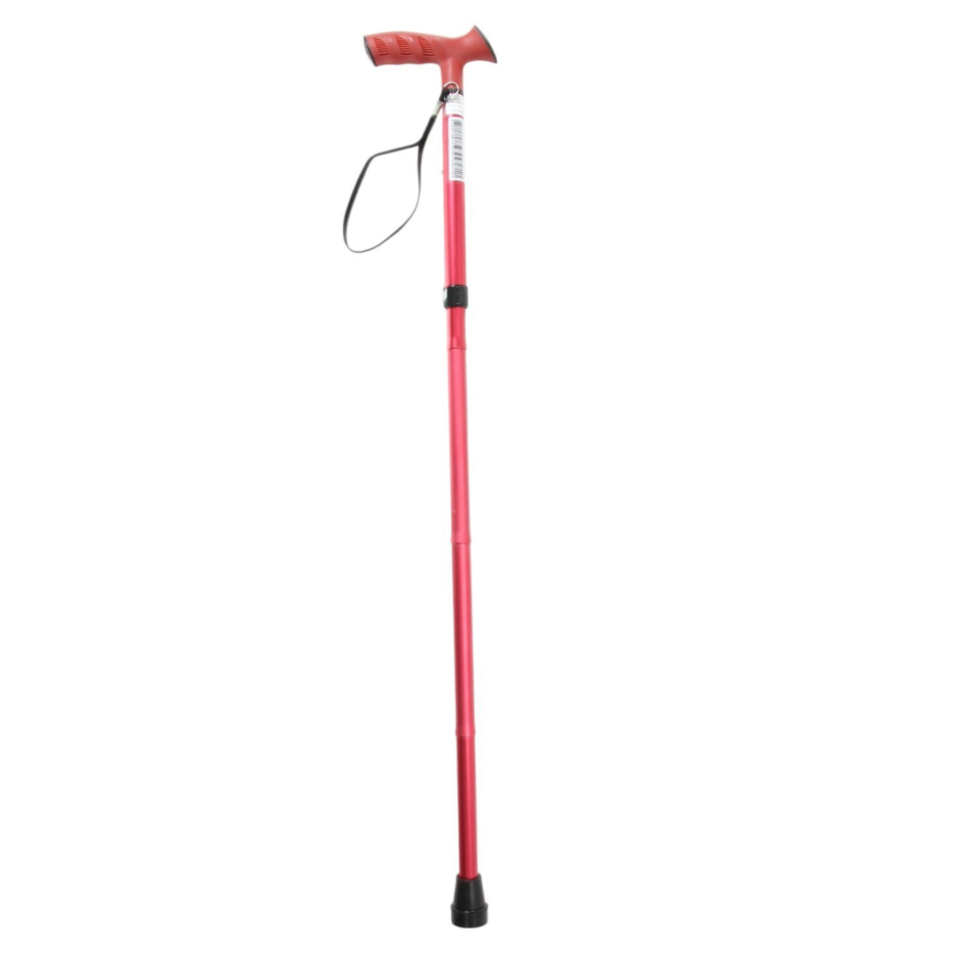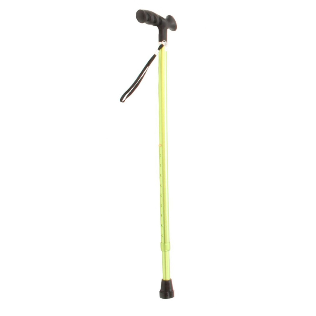 De wandelstok wordt geleverd met een rubberen stokdop en polsbandje, en is verkrijgbaar in meerdere kleuren.