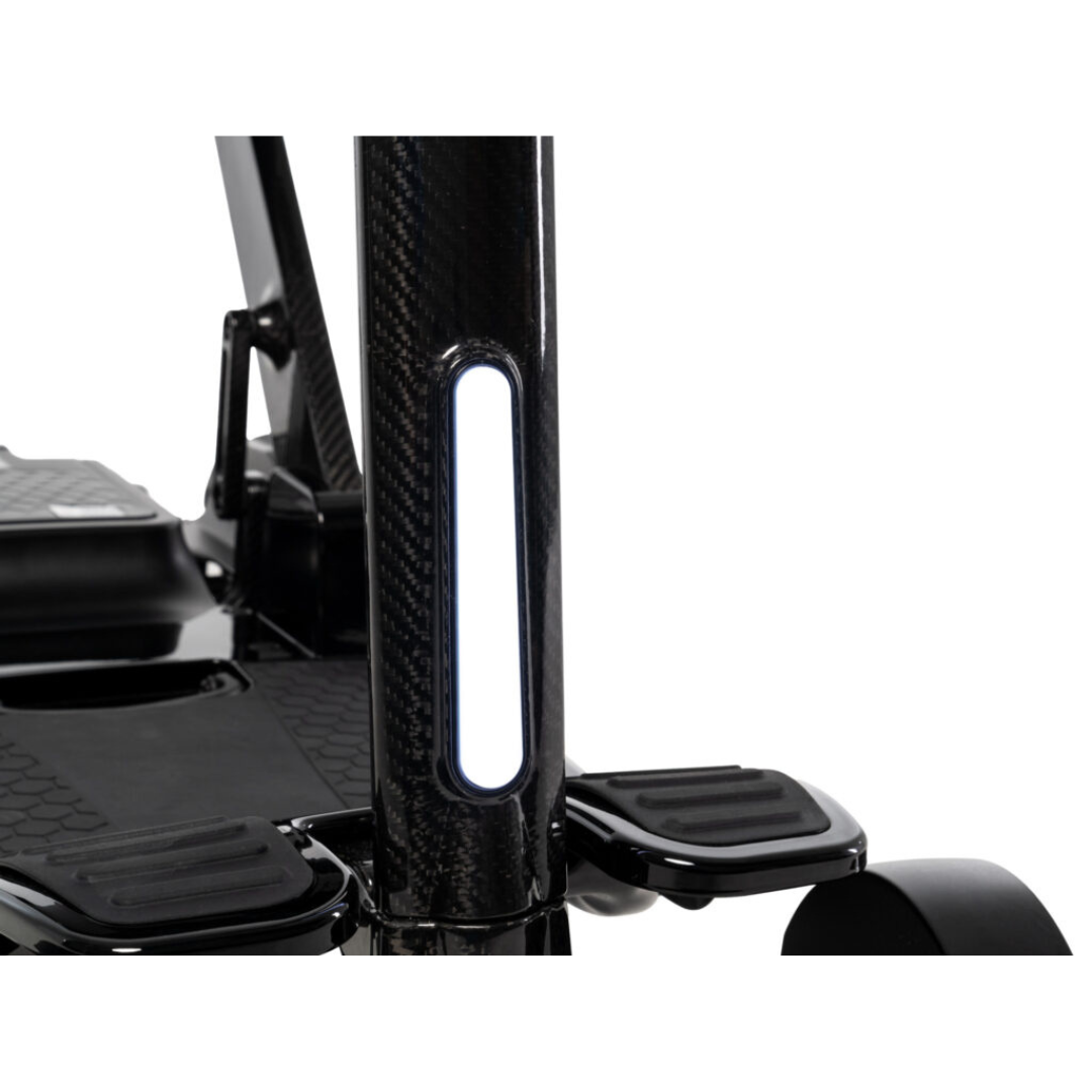 Niet alleen het frame, maar ook de velgen en stuurkolom zijn volledig uit carbon vervaardigd. Hierdoor zet deze scooter een nieuwe standaard in draagbaarheid en design binnen het mobiliteitssegment.
