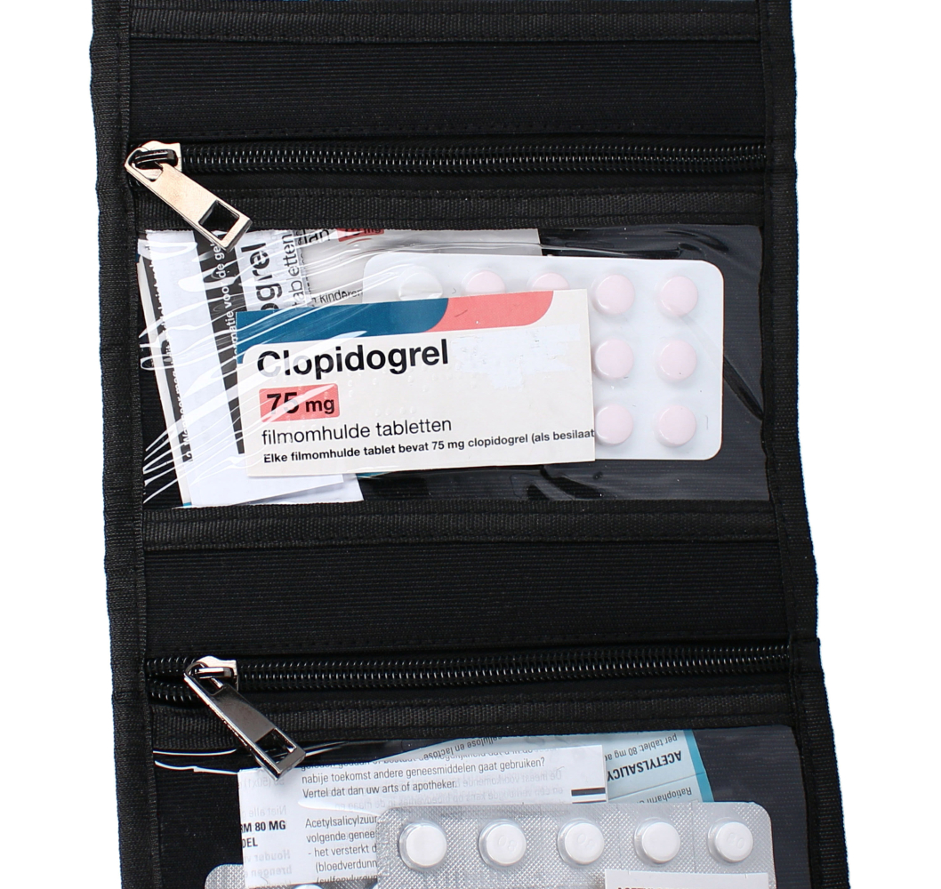 Praktische medicijntas voor uw medicijnen in blisterverpakking. Tot vijf verschillende medicijnen neemt u voortaan overzichtelijk in een klein pakketje mee, door de 5 transparante ritsvakken. In ieder vak passen 2 tot 3 pillenstrips, de medicijngegevens en bijsluiter. U kunt het oprollen tot een klein pakketje dat u makkelijk meeneemt, en weer uitrollen waardoor u onmiddellijk overzicht heeft. De oproletui heeft tevens een ophanghaakje, een handige polsband en een medisch ID kaartje op achterzijde.