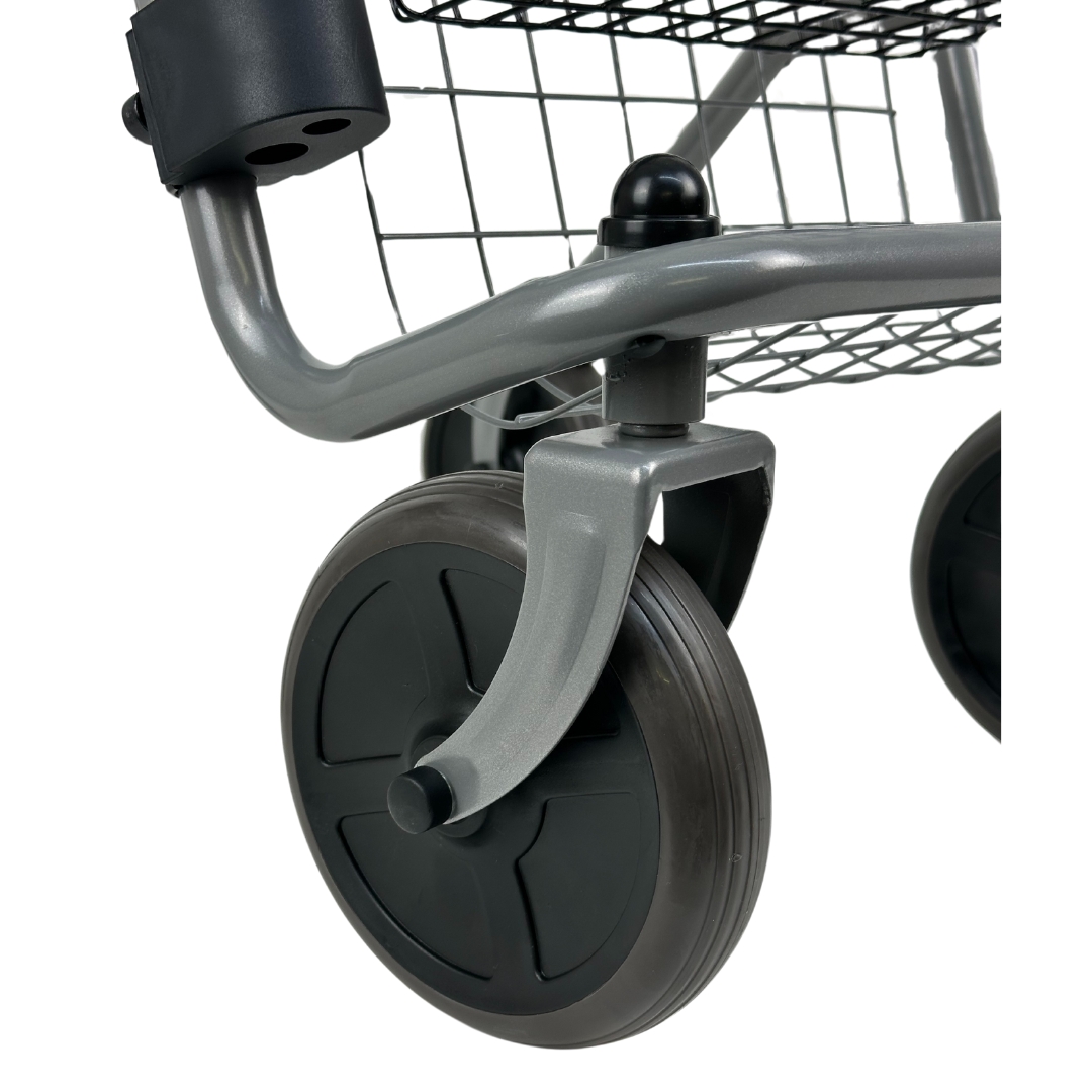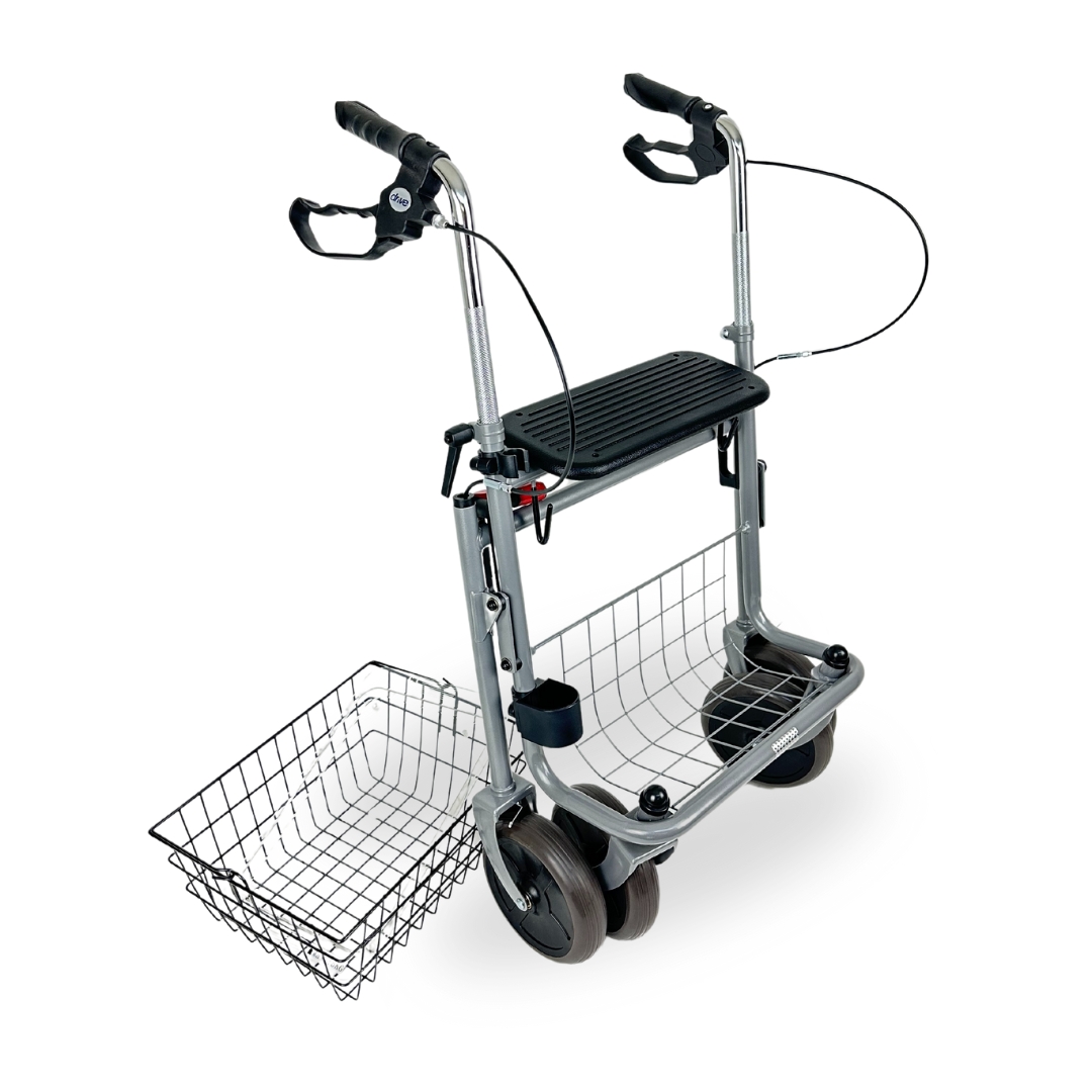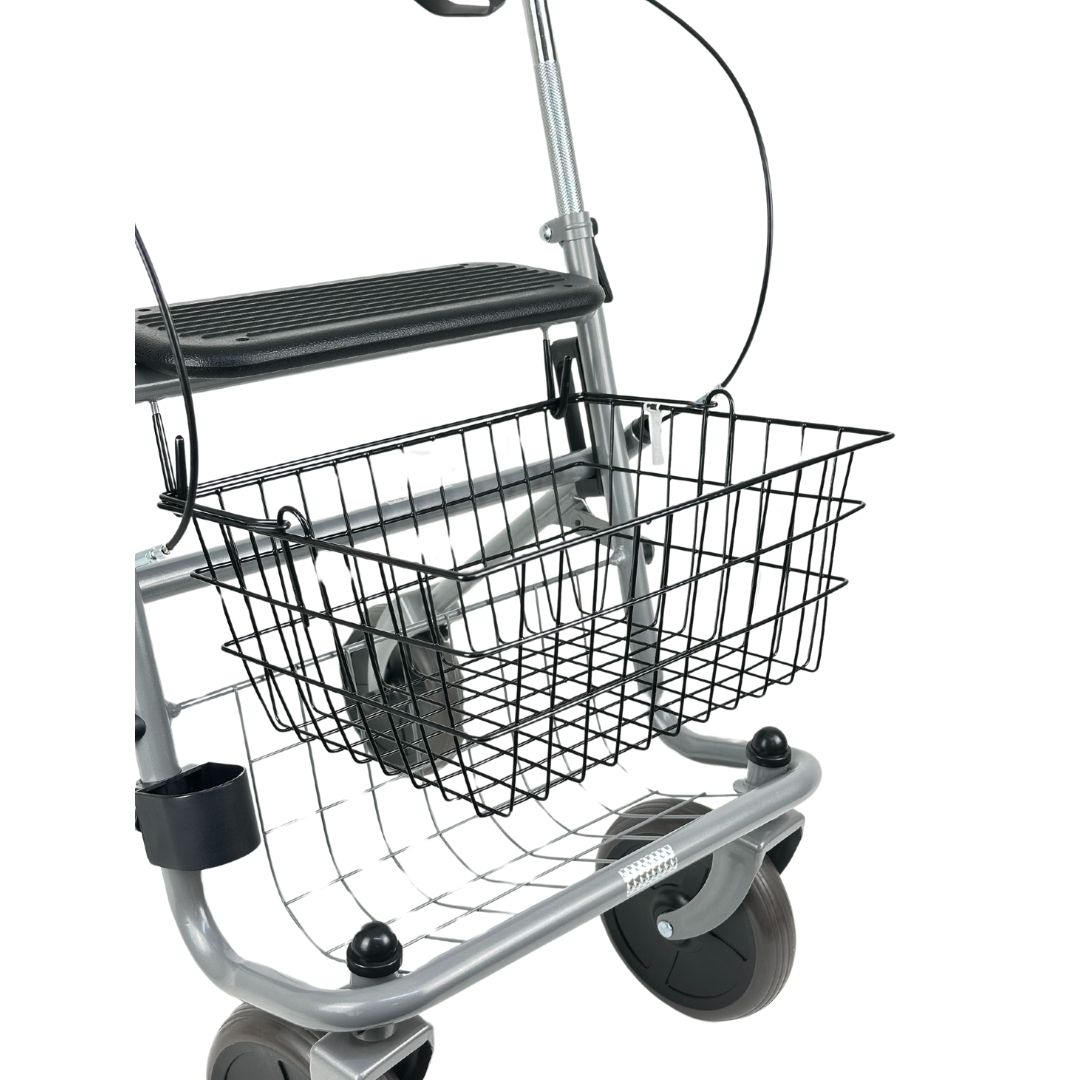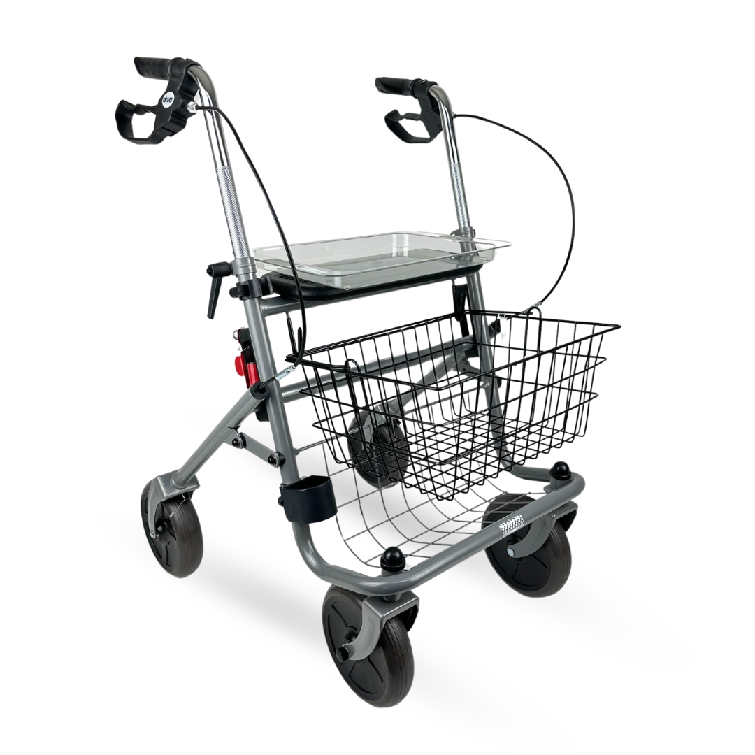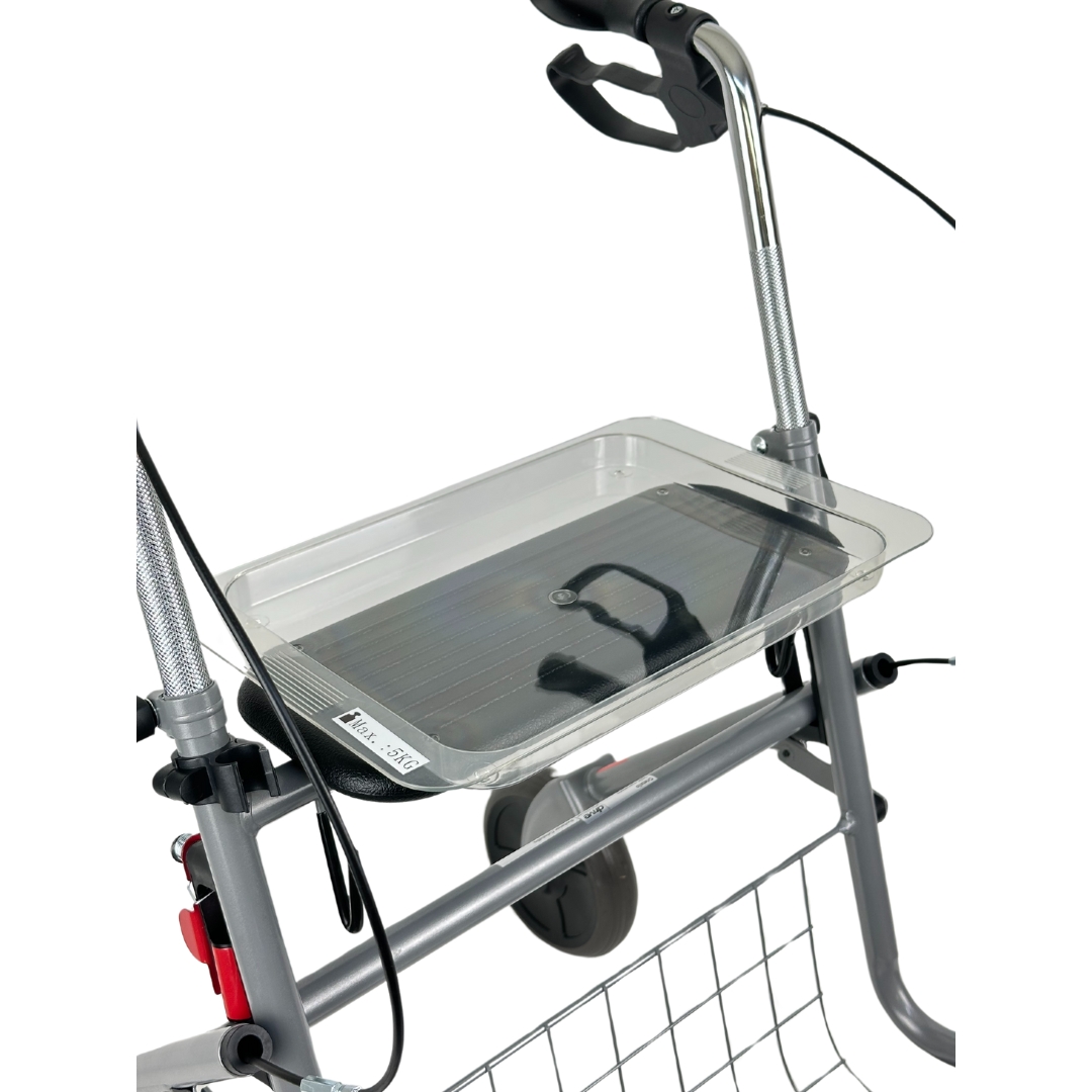 Het compacte vouwmechanisme met automatische vergrendeling maakt hem eenvoudig mee te nemen en op te bergen. Voor extra veiligheid is de rollator uitgerust met reflectoren en multifunctionele remmen met parkeerstand.