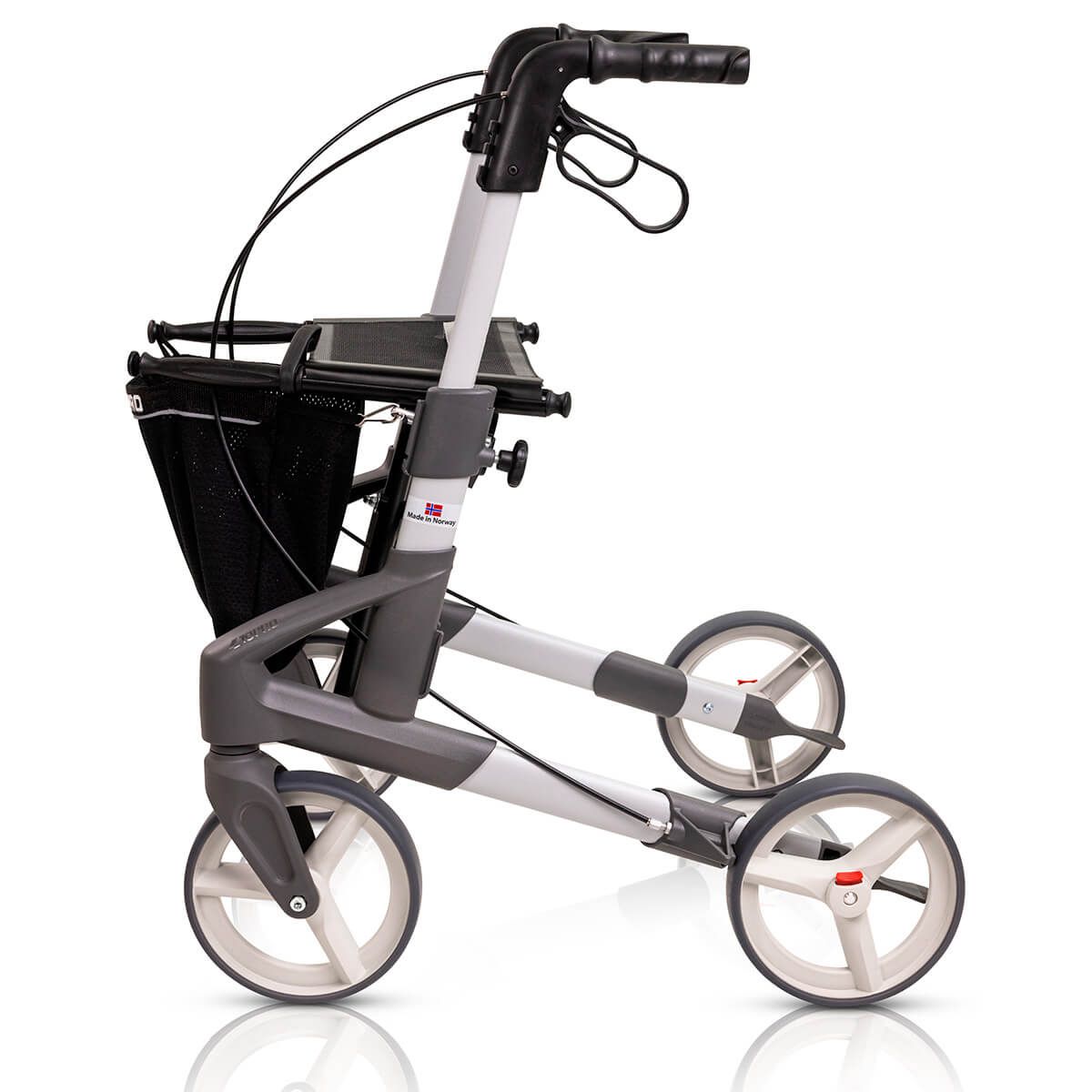 De Troja Original kan met één hand zijwaarts worden opgevouwen, waardoor hij compact is voor transport of opslag. Zelfs ingeklapt blijft de rollator stabiel op zijn wielen staan – ideaal voor onderweg of thuis.