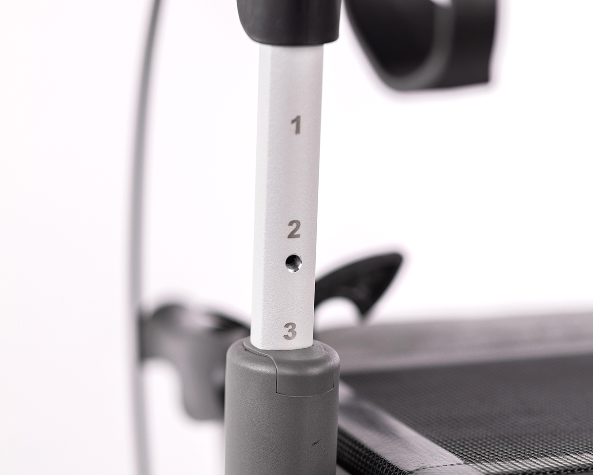 Met de gereedschapsvrije hoogteverstelling past u de handgrepen eenvoudig aan op uw ideale hoogte. Dankzij de numerieke schaal stelt u de juiste positie snel in, en met de Memory-functie onthoudt de rollator uw voorkeurshoogte.