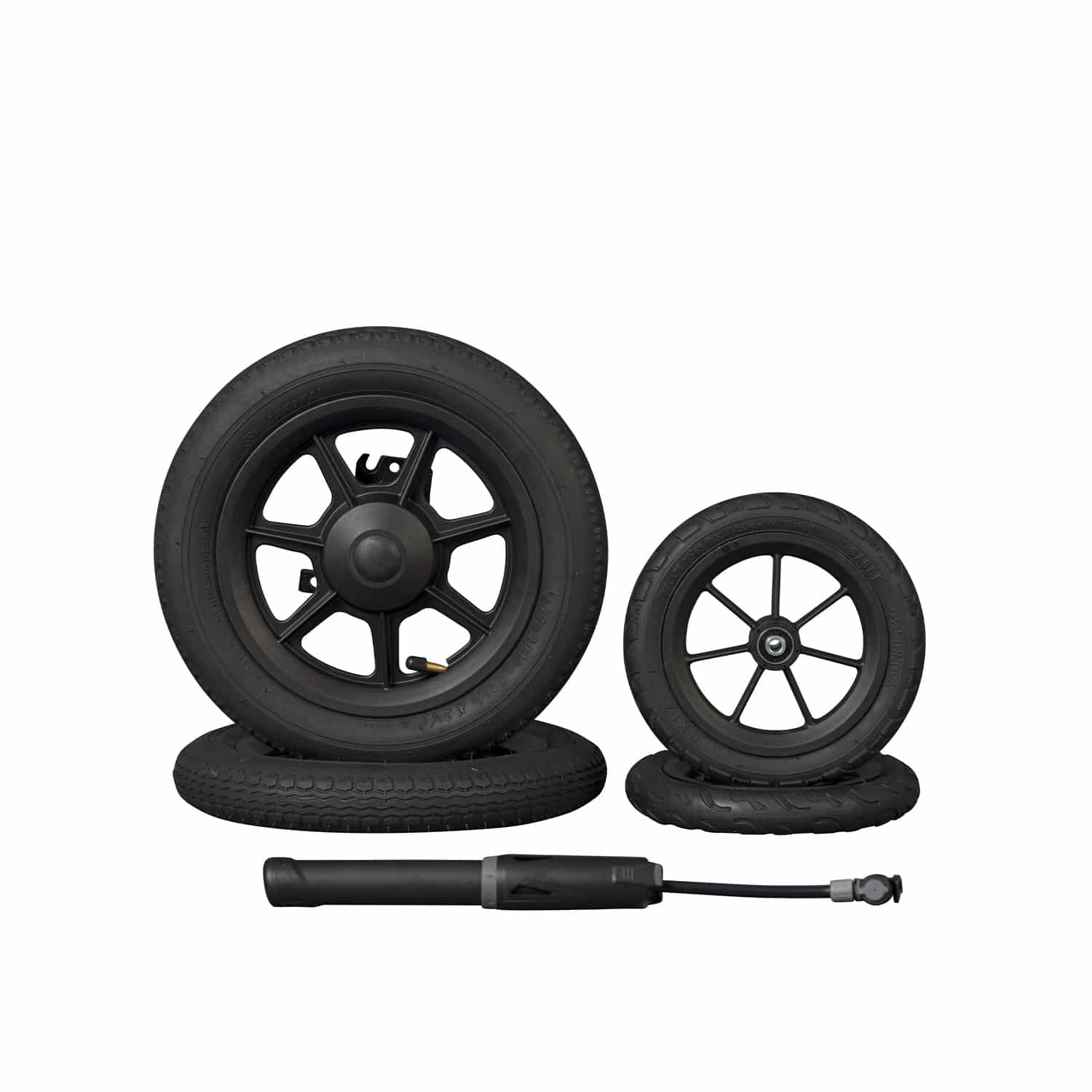 Complete set: Inclusief 2 luchtbanden (achter), 2 schuimgevulde banden (voor) en een pompje.