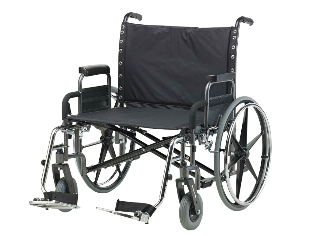 Het frame van de rolstoel is gemaakt van gehard staal zodat er een vele hogere maximale belasting. Ook is de voorvork versterkt voor een hogere belasting. De hand- en beensteunen zijn van een mooie chrome kleur, ook is het mogelijk om de beensteunen eraf te halen. Aan de beensteunen zijn voetplaten bevestigd die ook weggeklapt kunnen worden zodat u uw voeten op de grond kunt zetten. De armleggers zijn afneembaar. De afmetingen van de verharde PU voorwielen zijn 200mm × 50mm, de 24 inch achterwielen zijn ook verhard en versterkt. De zitting en rugleuning zijn gemaakt van hoge kwaliteit nylon.